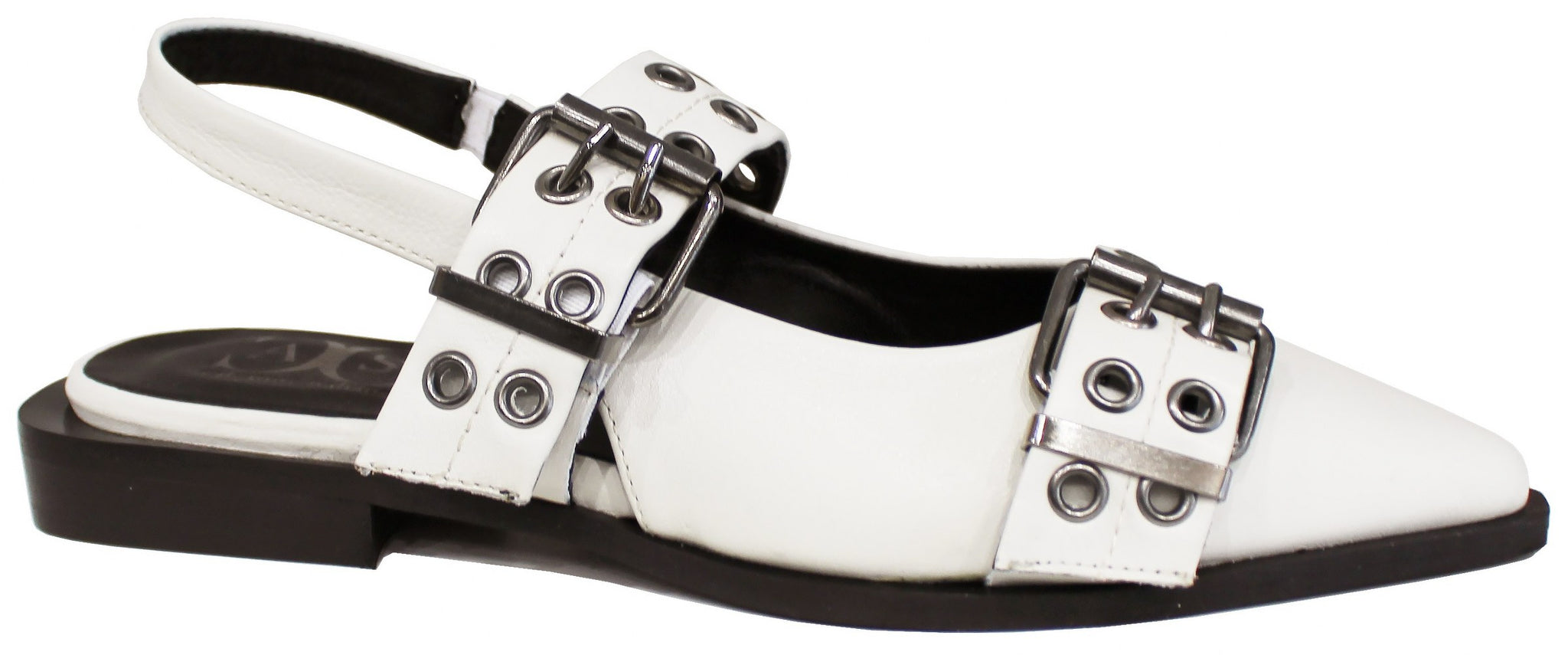 vista laterale interna scarpe donna ballerina slingback a punta bassa borchiata e bullonata con fibbie elegante articolo kbas-03 in vera pelle bianca con suola nera pellame molto morbido e accessori argento con cinturino elastico alla caviglia tallone 100% made in italy scarpe con negozio a civitanova marche collezione moda primavera estate calzature artigianali online spedizione in tutta italia pagamento alla consegna
