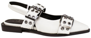 scarpe donna ballerina slingback a punta bassa borchiata e bullonata con fibbie elegante articolo kbas-03 in vera pelle bianca con suola nera pellame molto morbido e accessori argento con cinturino elastico alla caviglia tallone 100% made in italy scarpe con negozio a civitanova marche collezione moda primavera estate calzature artigianali online spedizione in tutta italia pagamento alla consegna