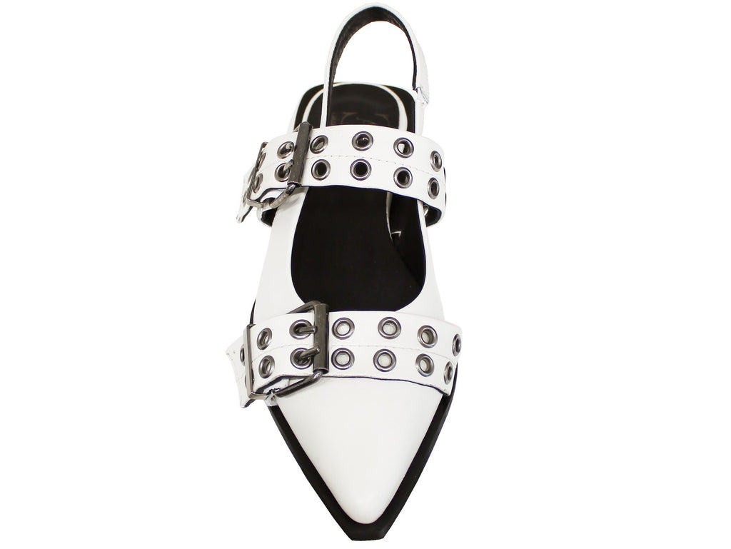 Bellissima slingback artigianale bassa e borchiata, modello KBAS-03, in vera pelle bianca con suola nera, dalla bellissima forma elegante a punta; modello versatile e di gran tendenza che non può assolutamente mancare nella collezione di una donna!
