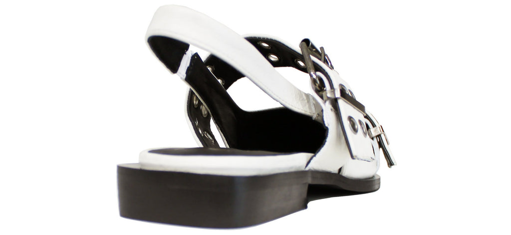 vista posteriore del tacco scarpe donna ballerina slingback a punta bassa borchiata e bullonata con fibbie elegante articolo kbas-03 in vera pelle bianca con suola nera pellame molto morbido e accessori argento con cinturino elastico alla caviglia tallone 100% made in italy scarpe con negozio a civitanova marche collezione moda primavera estate calzature artigianali online spedizione in tutta italia pagamento alla consegna