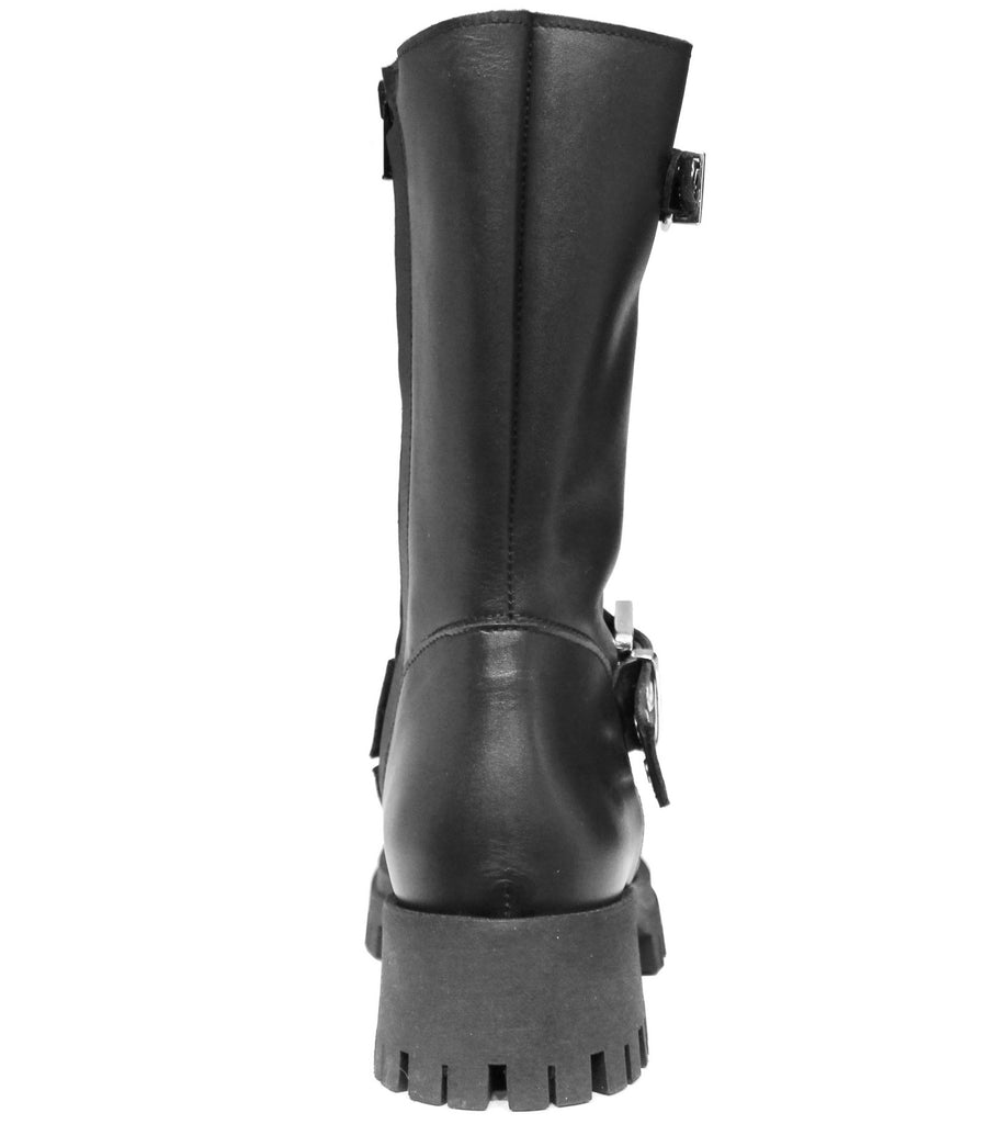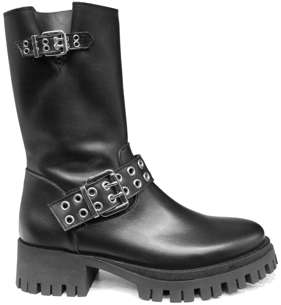 Anfibio donna artigianale, modello CROWN BB23, realizzato in vera pelle nera con fibbie e cinghie borchiate