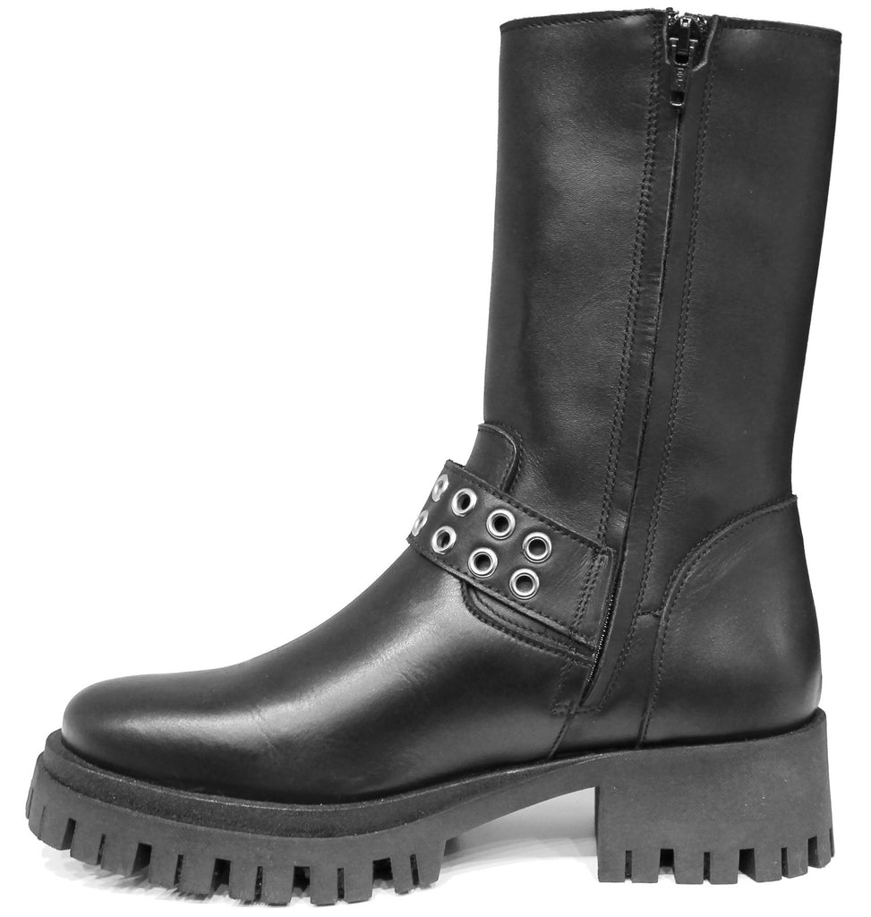 scarpe donna di tendenza anfibi stivaletti neri con fibbie borchie in vera pelle marchio crown BB 23 stile casual eleganti sportivi con cerniera laterale e punta rotonda suola carrarmato flessibile calzature artigianali online 100% made in italy comode con negozio a civitanova marche collezione moda spedizioni in tutta Italia pagamento alla consegna