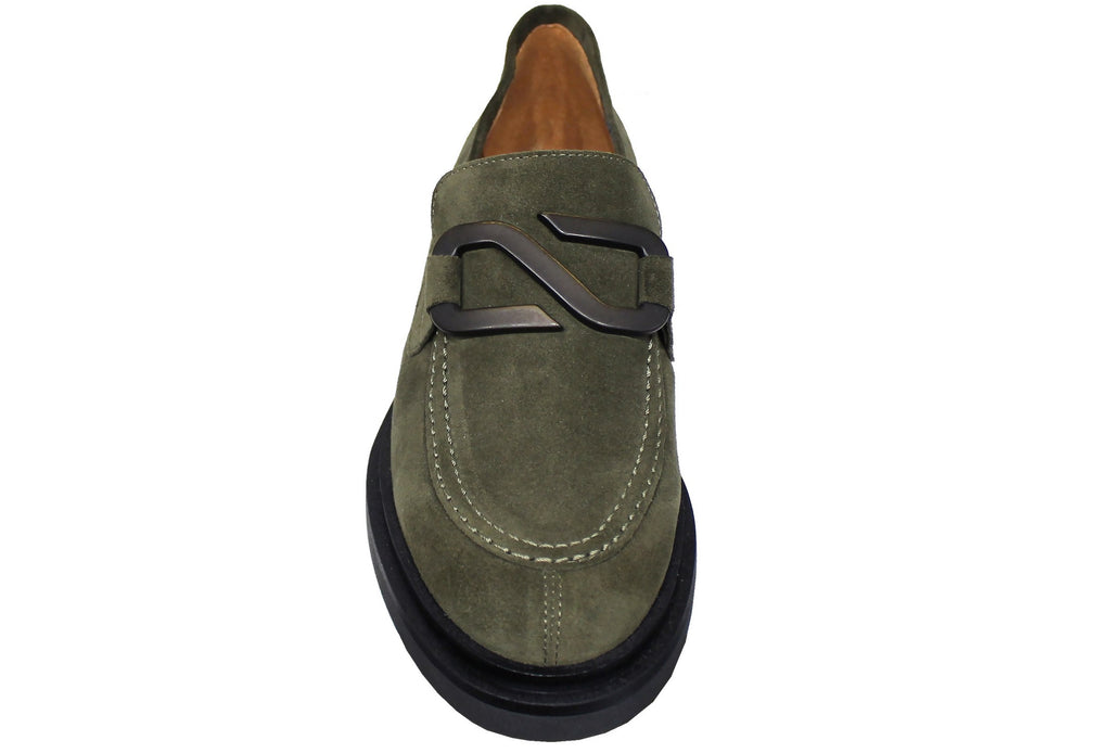 Bellissimo mocassino artigianale dallo stile casual elegante/sportivo, modello ANGEL ALARCON 24592, in vera pelle scamosciata verde arricchito da un bell'accessorio in tinta