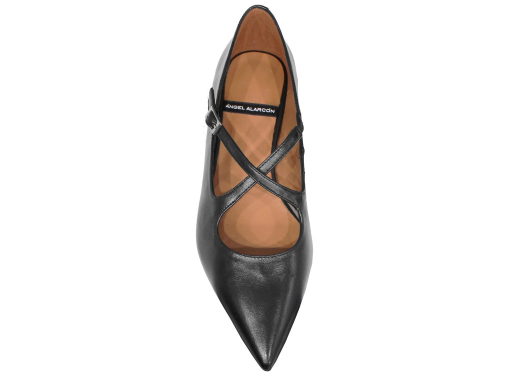 vista frontale dall'alto scarpe donna di tendenza ballerine nere  eleganti a punta in vera pelle con cinturino incrociato marchio angel alarcon 25531 stile casual per ufficio con tacco quadrato basso calzature artigianali online comode con negozio a civitanova marche collezione moda spedizioni in tutta Italia pagamento alla consegna