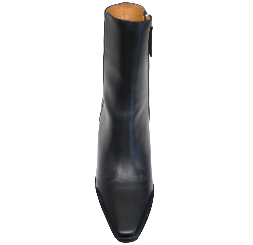 vista frontale scarpe tendenza donna tronchetti stivaletti eleganti con tacco medio alto e punta quadrata cerniera laterale marchio angel alarcon articolo 24566 in vera pelle nera calzature artigianali moda online con negozio a civitanova marche spedizioni in tutta Italia pagamento alla consegna