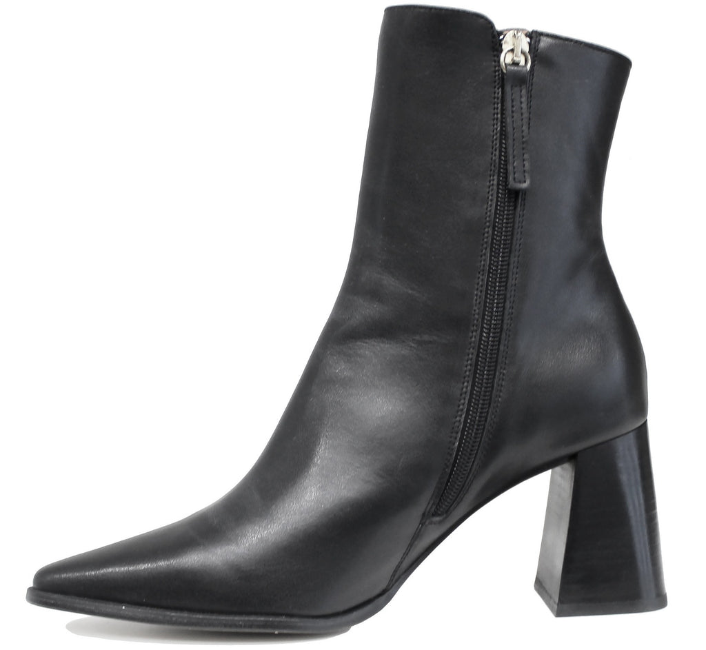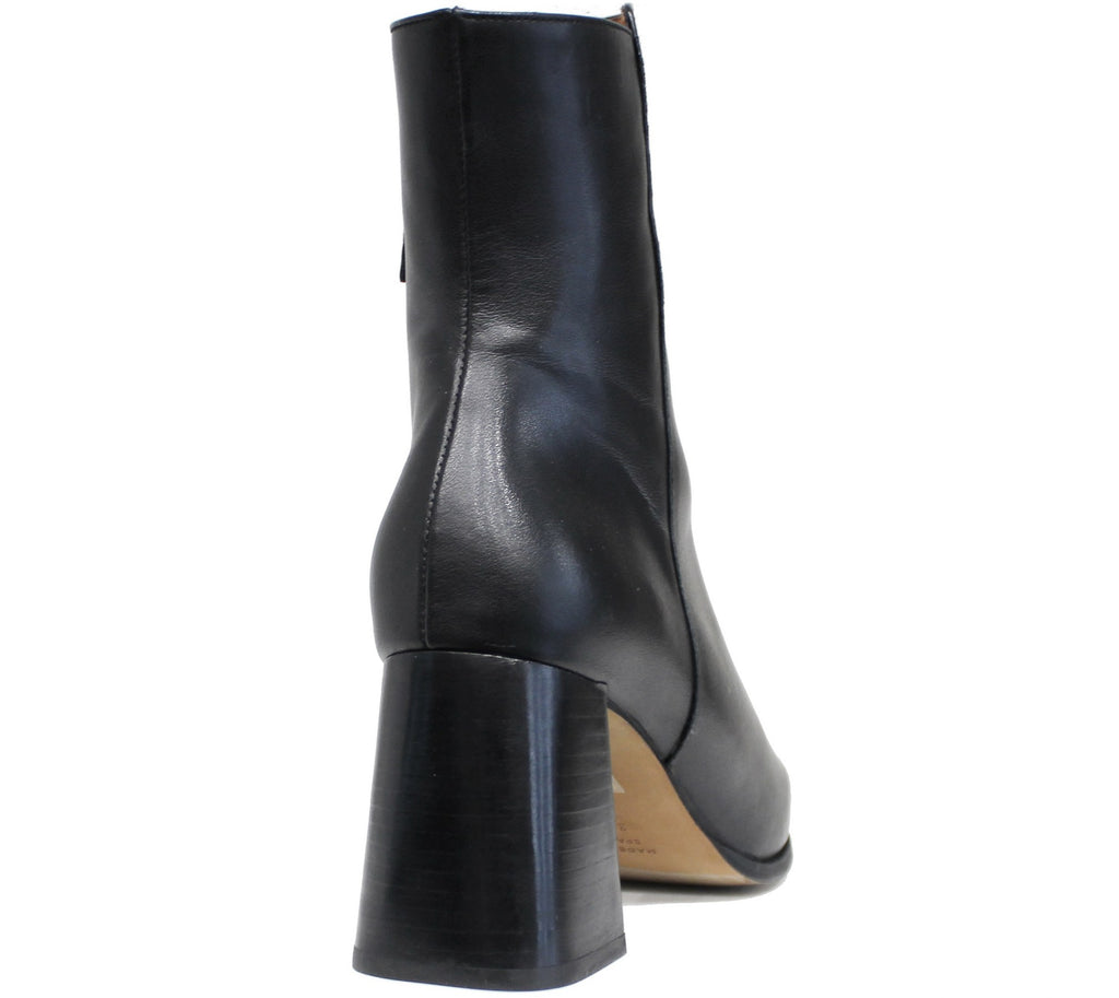 Bellissimo stivaletto artigianale con punta quadrata, modello ANGEL ALARCON 24566, in vera pelle nera con tacco largo medio-alto e una comodissima cerniera nella parte laterale dello stivaletto che ne facilita la calzata