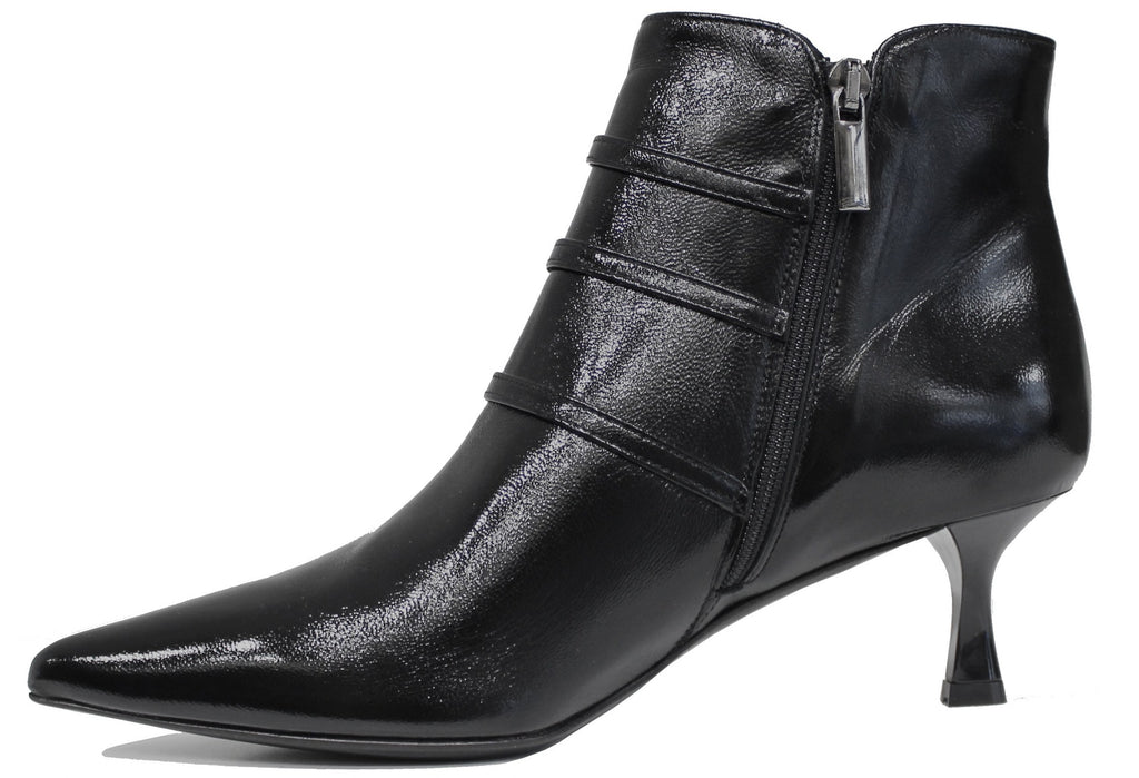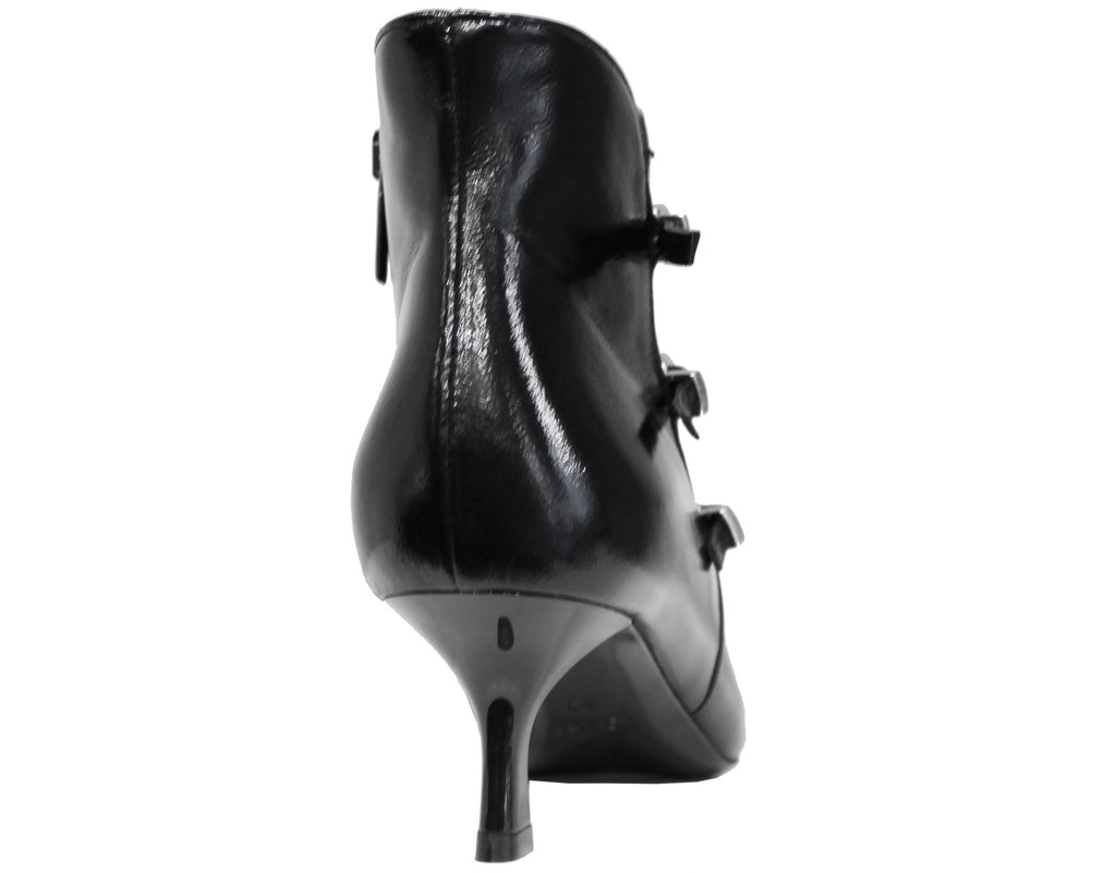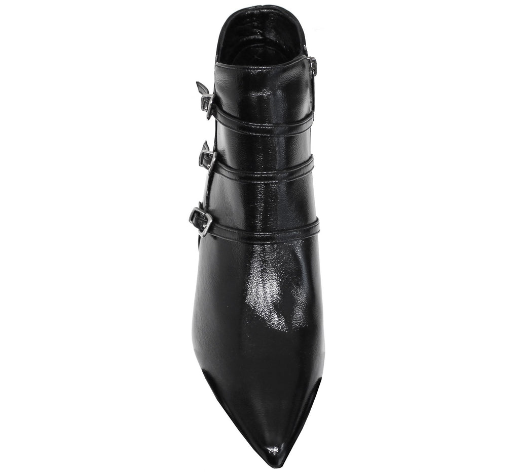 Tronchetto con tacco fino a rocchetto dalla bellissima e classica linea a punta impreziosito da tre fibbie laterali color argento; il modello A033 ha un morbidissimo pellame in vernice nera e una cerniera interna laterale per facilitarne la calzata