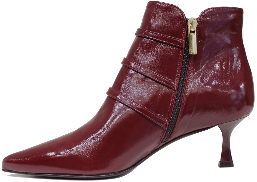 Tronchetto con tacco fino a rocchetto dalla bellissima e classica linea a punta impreziosito da tre fibbie laterali color oro; il modello A033 ha un morbidissimo pellame in vernice bordeaux e una cerniera interna laterale per facilitarne la calzata