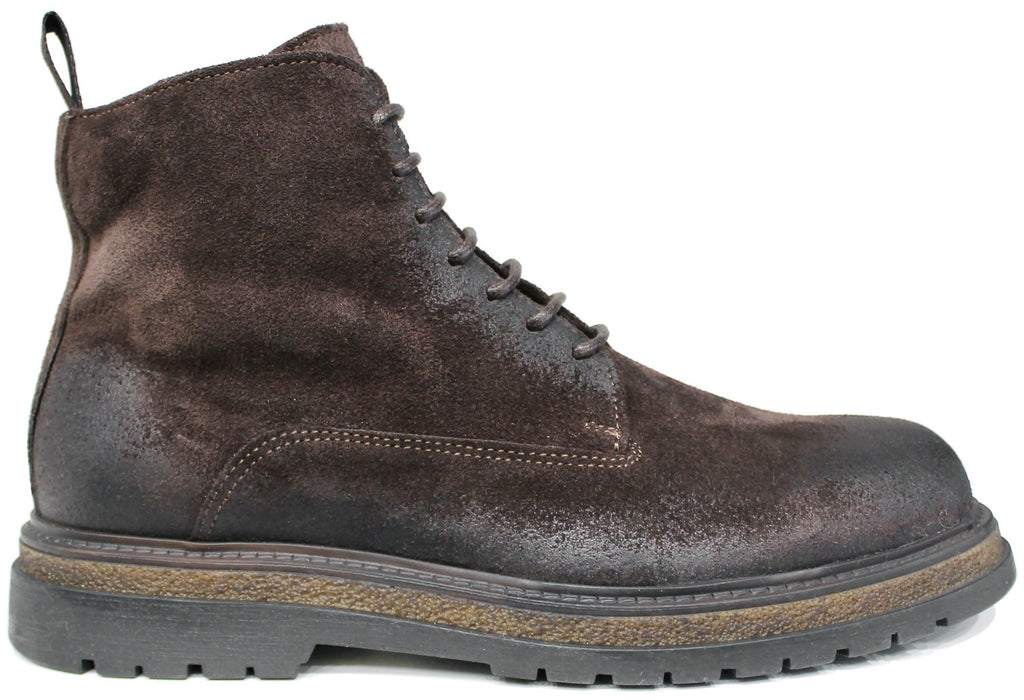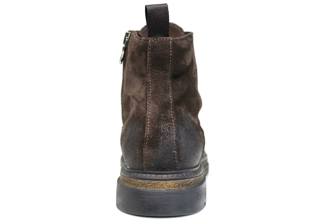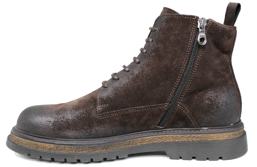 Stivaletto artigianale uomo, modello 1241, realizzato in vera pelle scamosciata ingrassata marone testa di moro che, oltre a essere stringato, presenta una comoda cerniera laterale (nascosta nella parte interna) che ne facilità la calzata