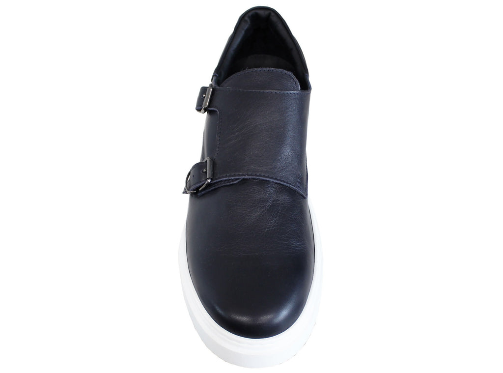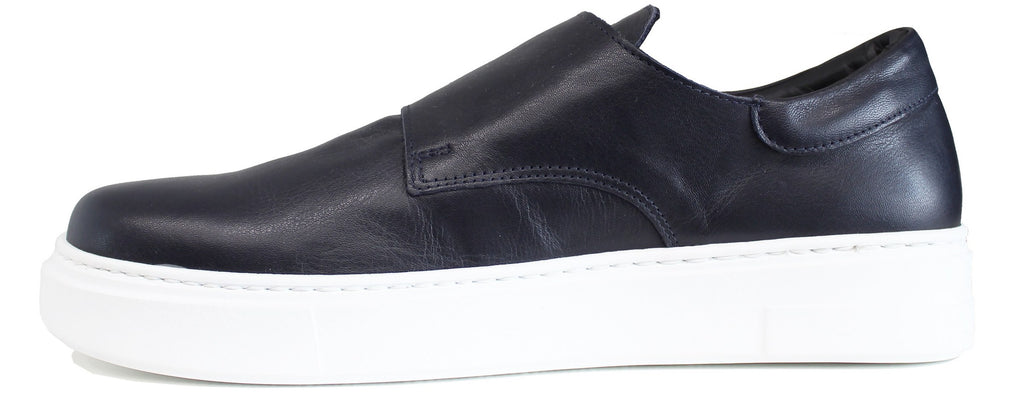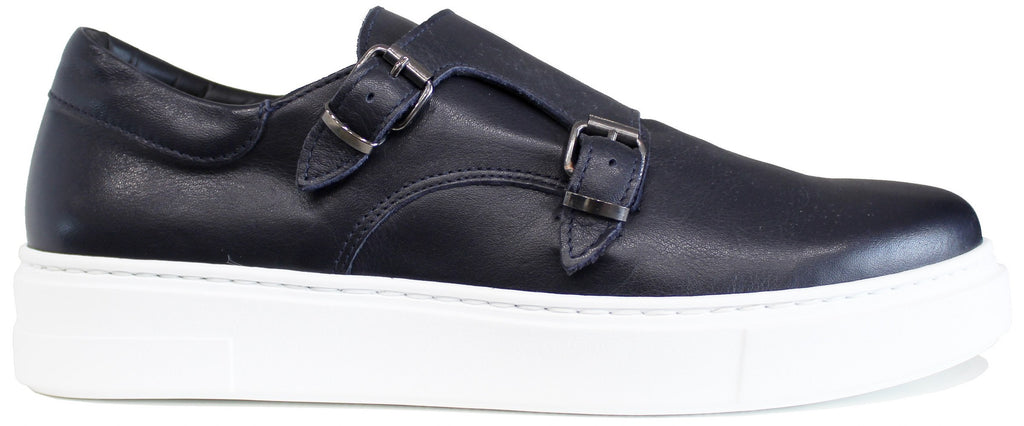 Sneaker artigianale uomo, modello 1730, in vera pelle blu notte, molto morbida, con tomaia elegante caratterizzata dall'inconfondibile doppia fibbia stile Monk Strap