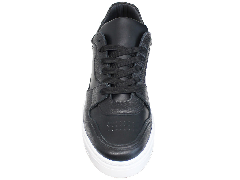 vista frontale dall'alto scarpe uomo tendenza sneaker basse casual eleganti sportive in vera pelle nera con dettagli martellati e buchetti sulla punta suola alta rialzata articolo AR80-M calzature artigianali online 100% made in italy negozio a civitanova marche collezione moda soletta morbida estraibile per plantare spedizioni in tutta italia pagamento alla consegna