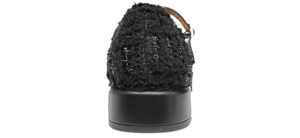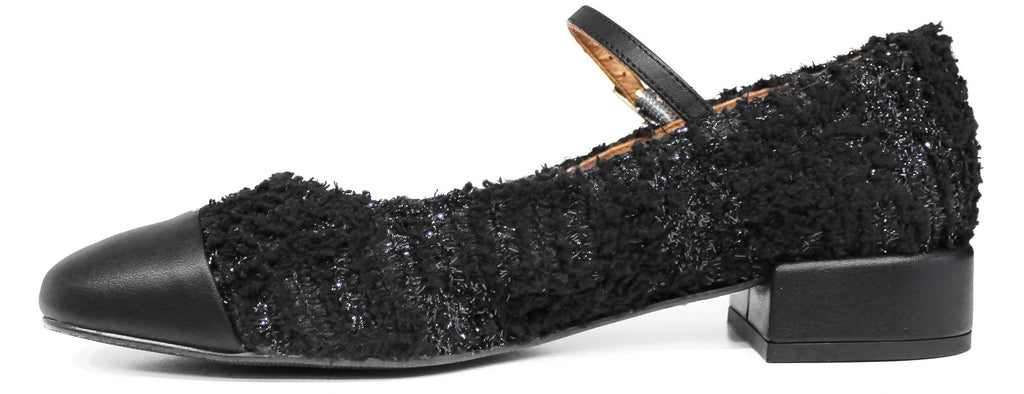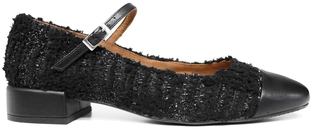 Ballerina donna artigianale dallo stile raffinato e femminile, modello ANGEL ALARCON 25521, realizzata in vera pelle nera e tessuto "lanoso" con delicati riflessi glitter che donano luminosità al modello.