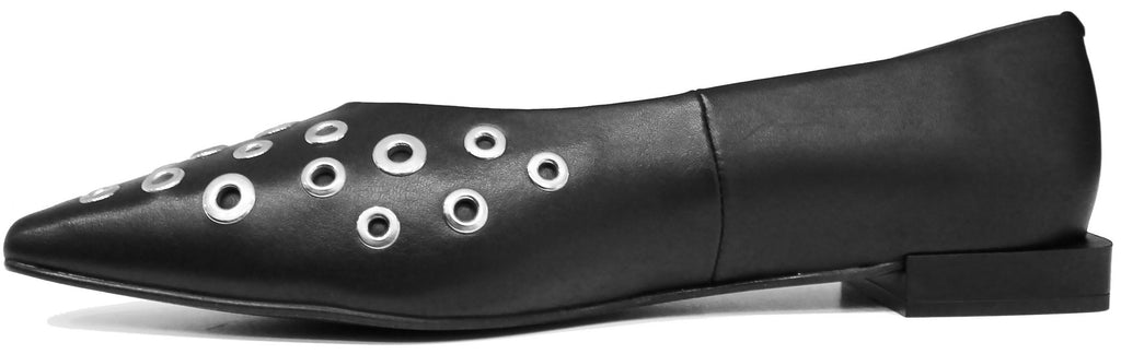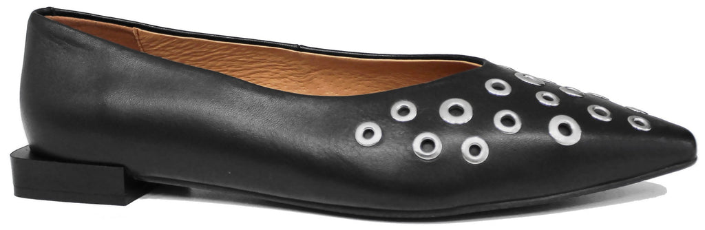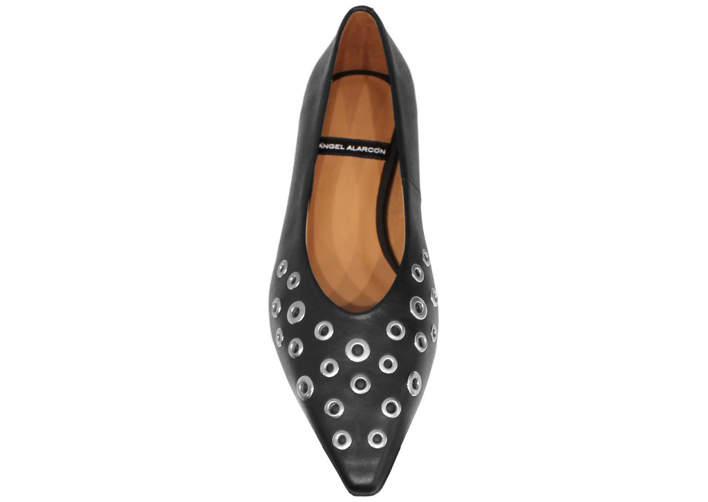 Ballerina donna artigianale con punta affusolata, modello ANGEL ALARCON 25509, realizzata in vera pelle morbidissima nera e abbellita da dei bellissimi occhielli rotondi metallici color argento.