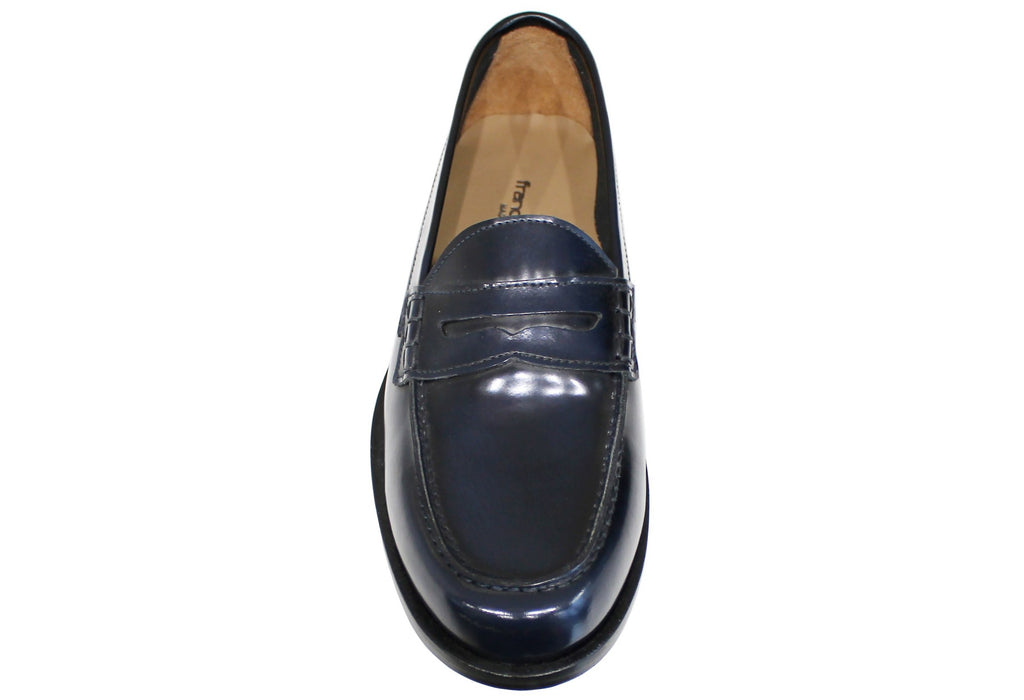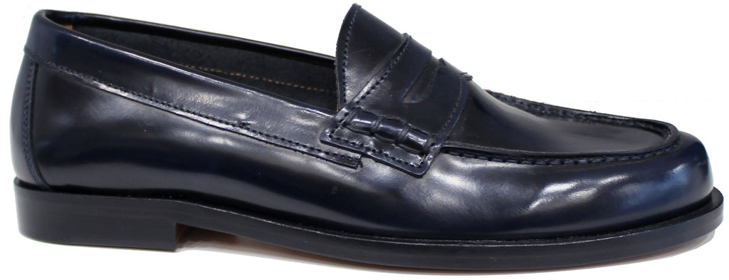 Mocassino donna artigianale dalla classica forma intramontabile "college", modello D758, realizzato in vera pelle abrasivata blu notte, effetto lucido, con suola in vero cuoio cucita
