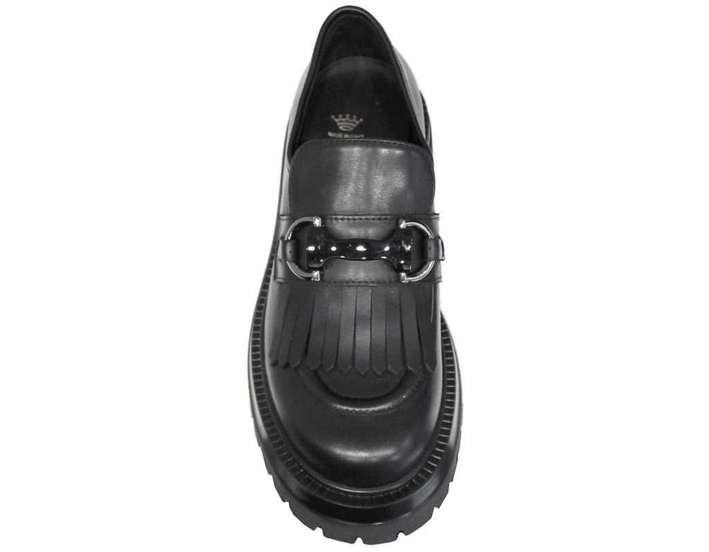 Mocassino donna artigianale con suola carrarmato, modello BB18, realizzato in vera pelle nera e arricchito da un bellissimo morsetto scuro e delle frange.