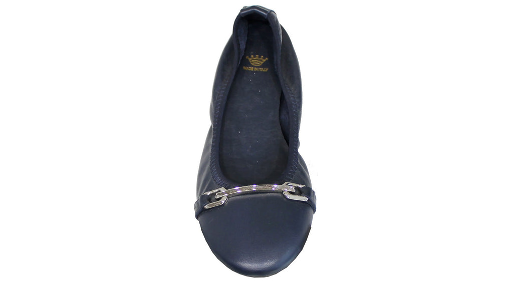 Ballerina donna artigianale, modello MINNI GA11624, realizzata in vera pelle morbidissima blu e abbellita da un bel morsetto argentato.