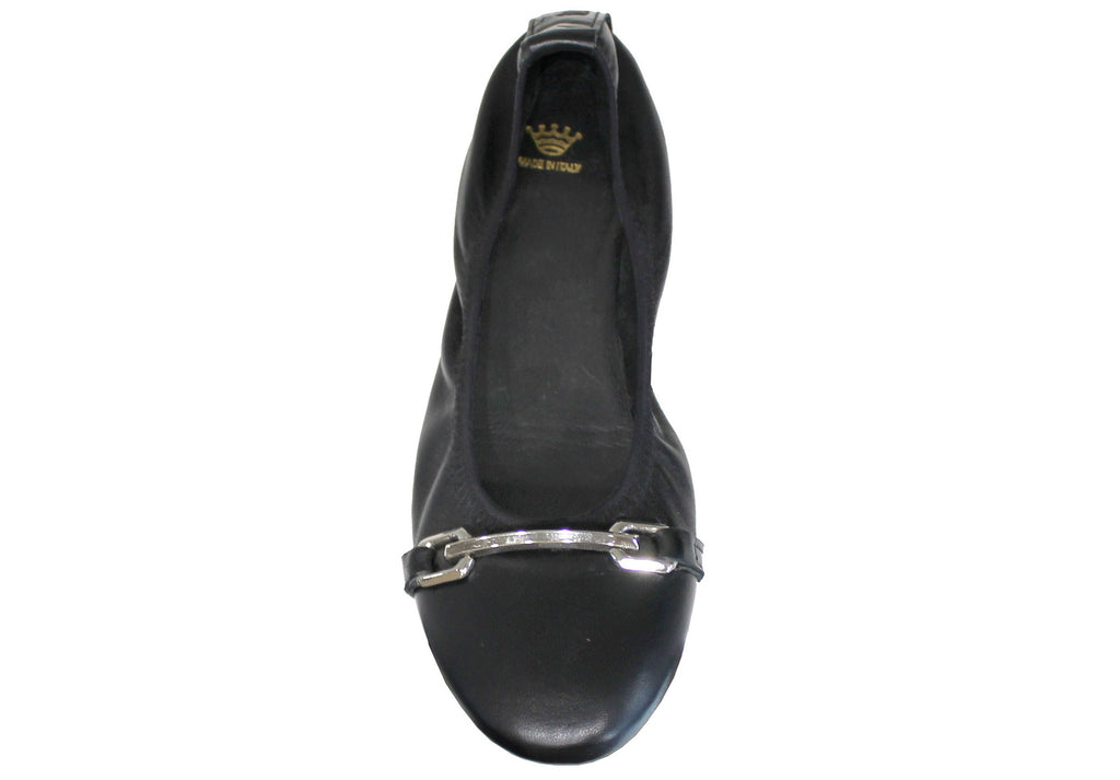 Ballerina donna artigianale, modello MINNI GA11624, realizzata in vera pelle morbidissima nera e abbellita da un bel morsetto argentato.