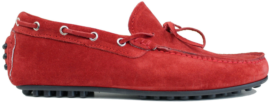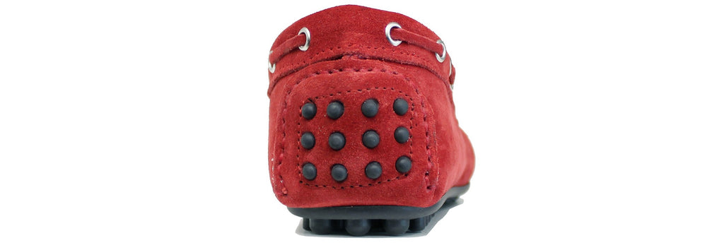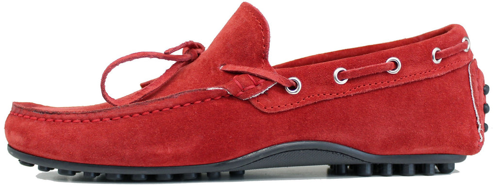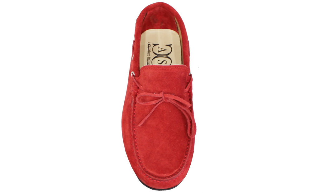 Mocassino uomo artigianale, stile BARCA, realizzato in vera pelle scamosciata rossa, molto morbida.