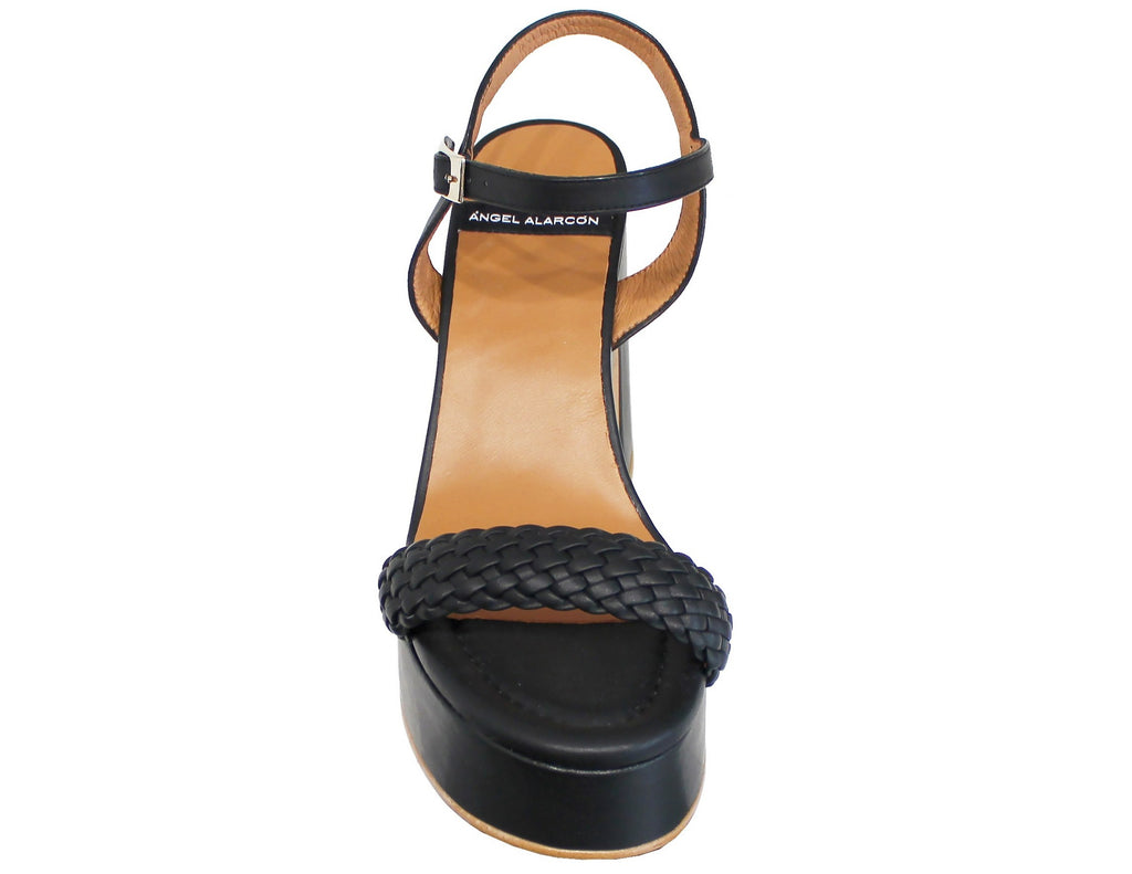 Comodo sandalo artigianale con tacco alto largo e plateau, modello ANGEL ALARCON 24091, in vera pelle nera, con cinturino alla caviglia e una bellissima fascia intrecciata
