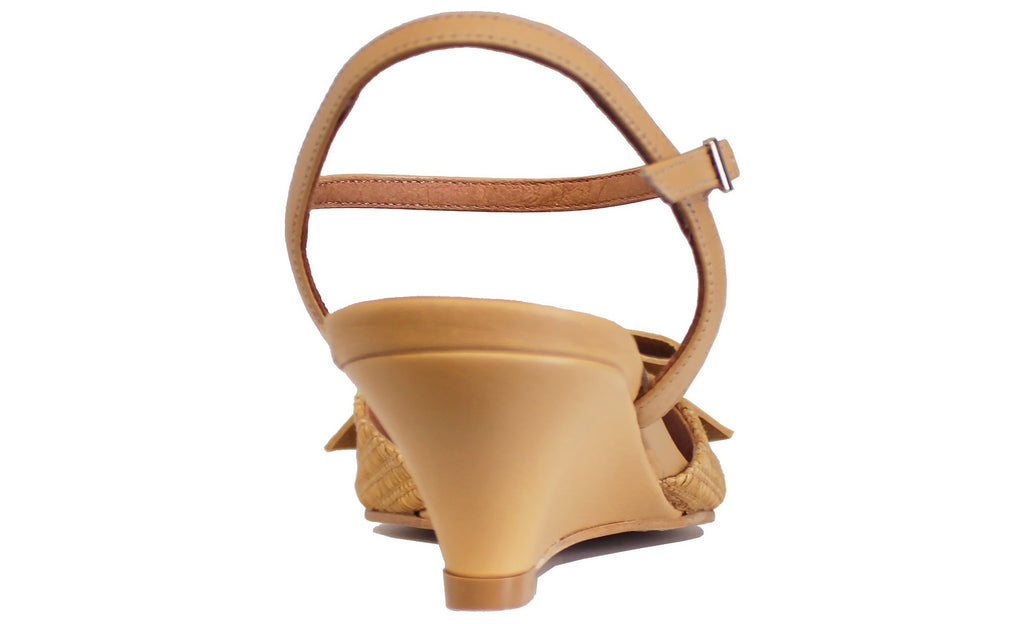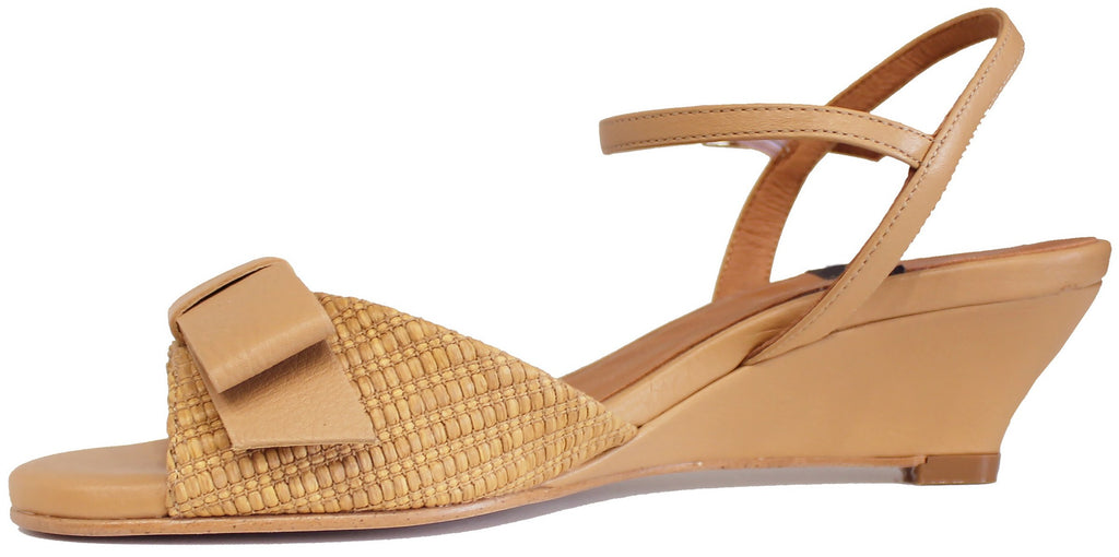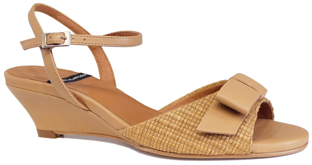 Zeppa donna artigianale, modello 25102, realizzata in rafia intrecciata e vera pelle colore cammello con cinturino alla caviglia e arricchita da un fiocco centrale
