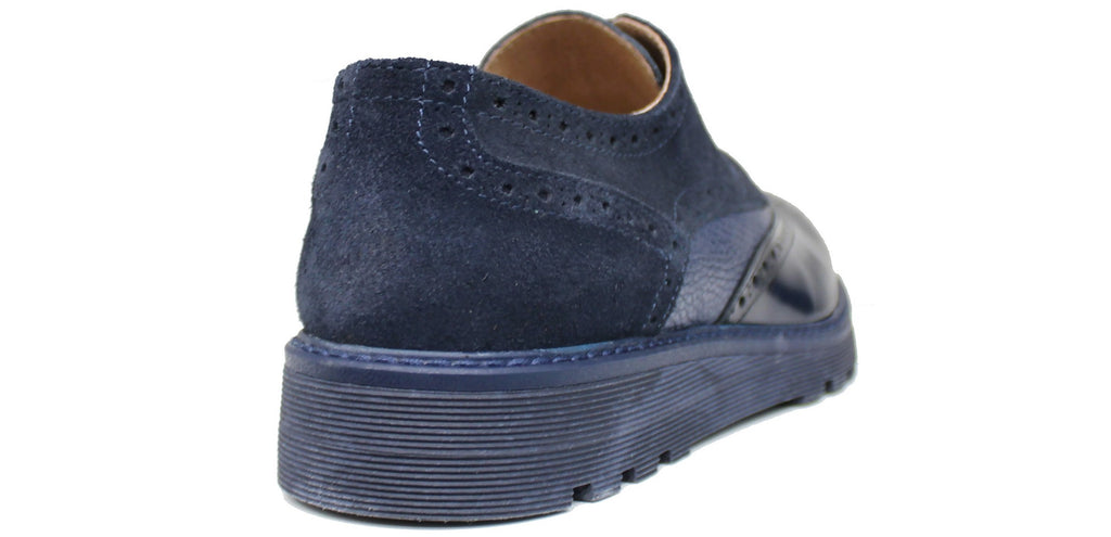 Bellissima francesina derby artigianale ricamata uomo, modello 3030, composta da un tris di diversi pellami, abrasivato lucido, camoscio e martellato tutti di colore blu e una bellissima suola stile zeppa che la rende da un lato elegante dall'altro sportiva; un modello che non può assolutamente mancare nella collezione di un uomo!