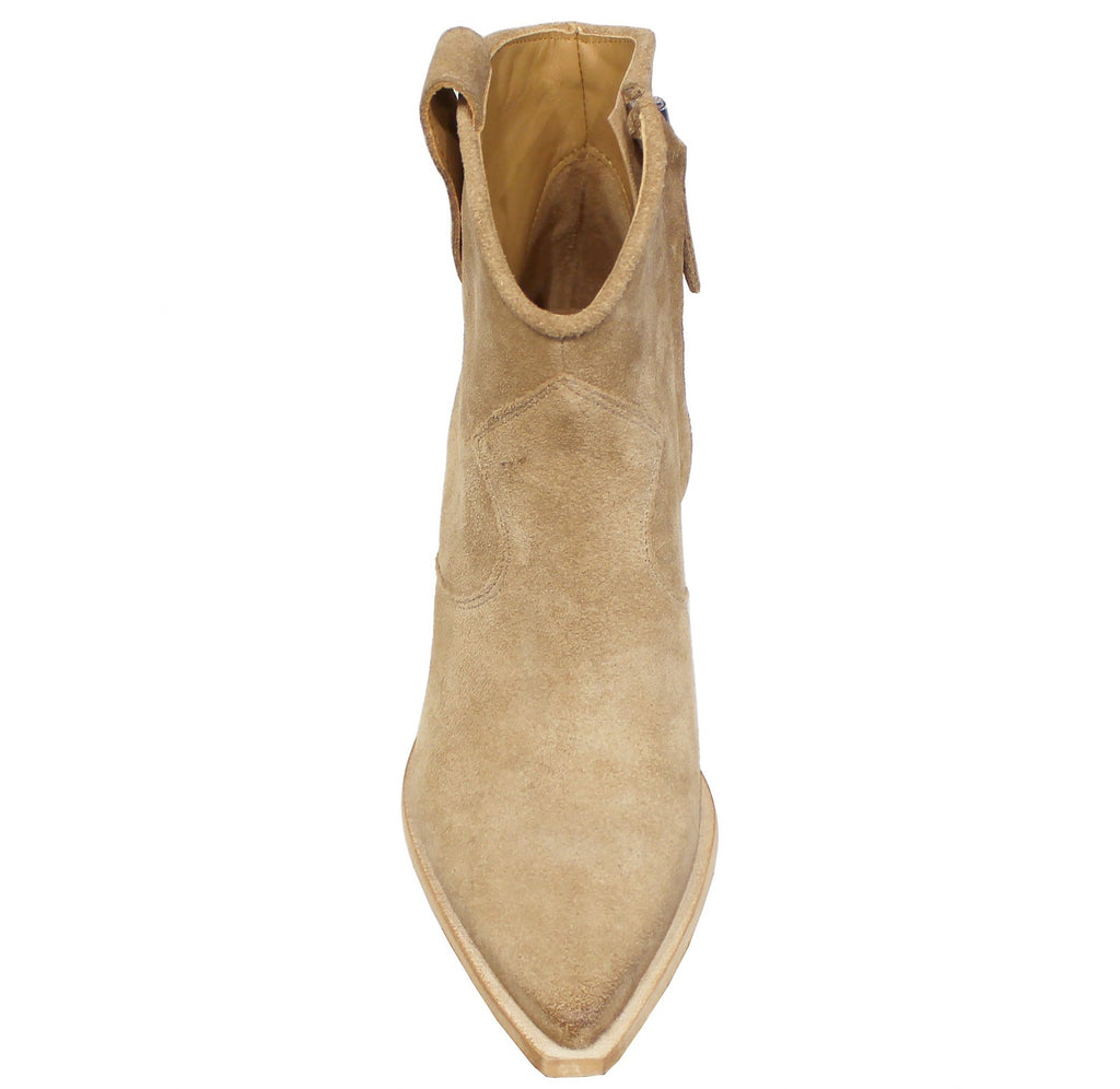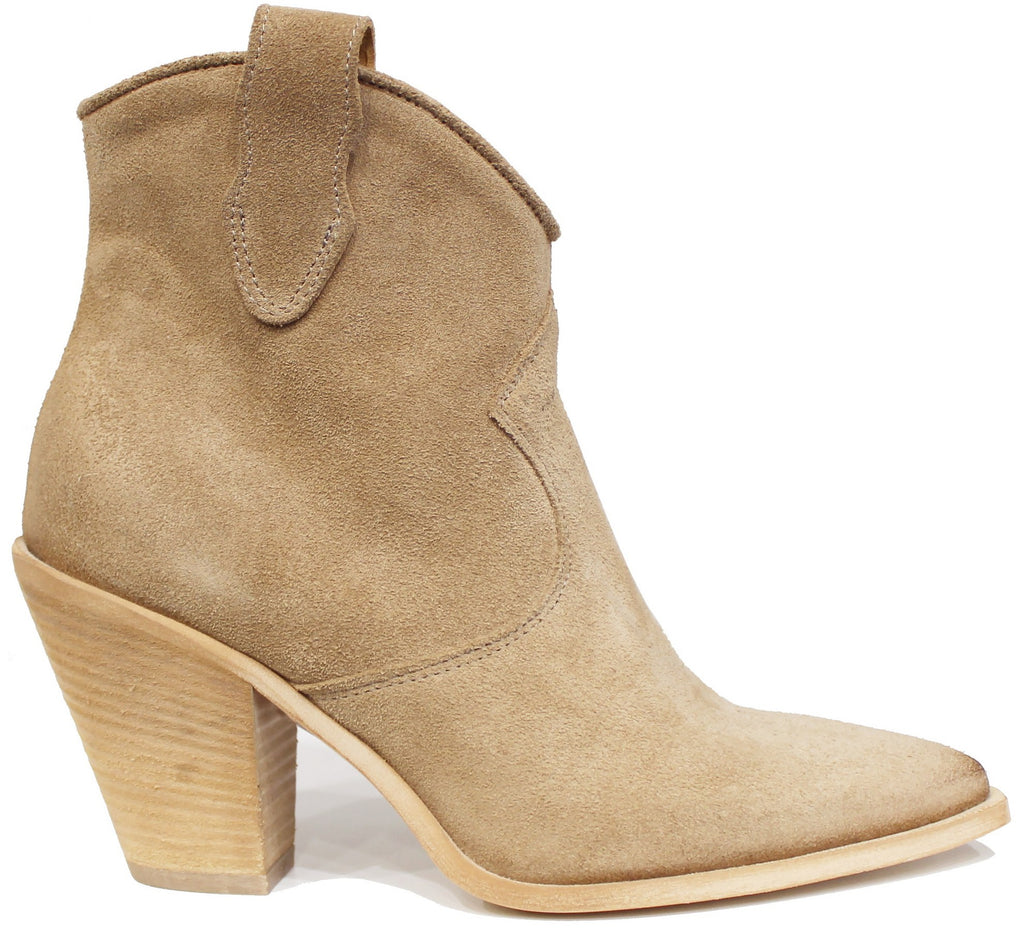 Texano donna a punta artigianale, modello ST03, realizzato in vera pelle scamosciata beige, molto morbida, con cerniera laterale