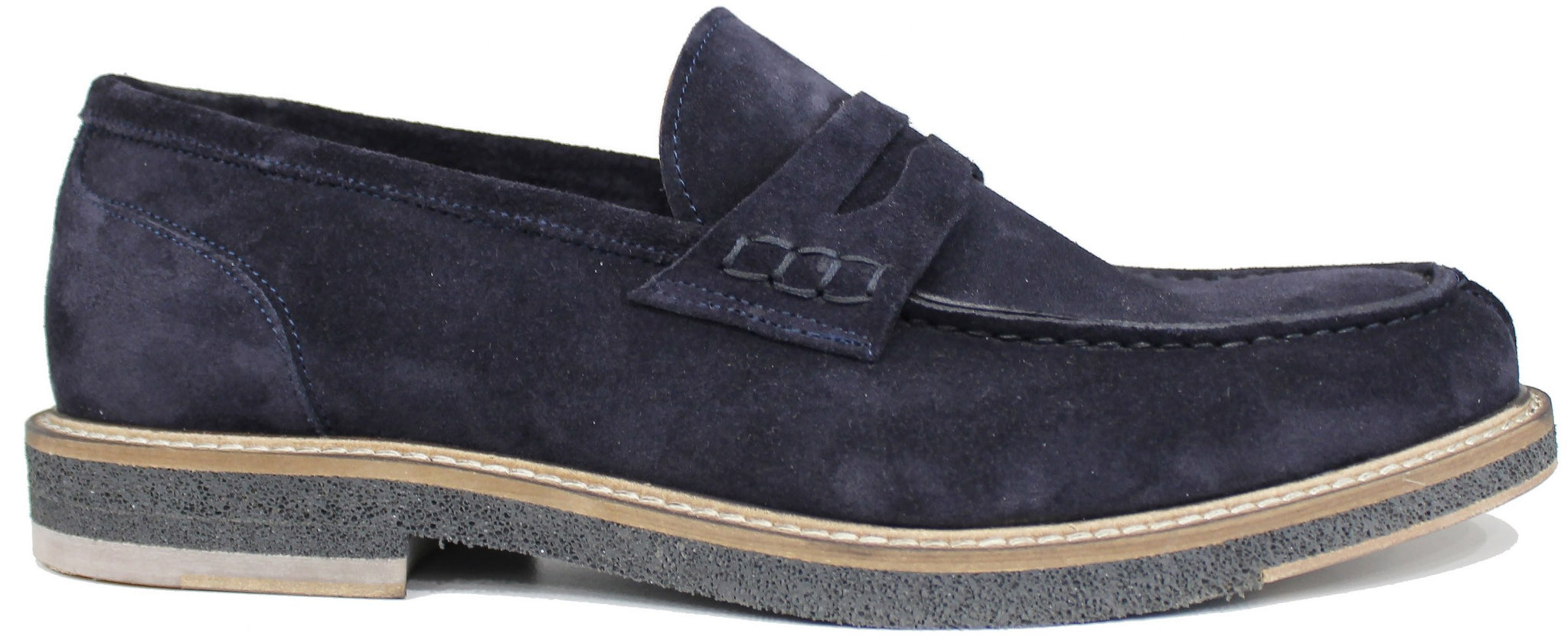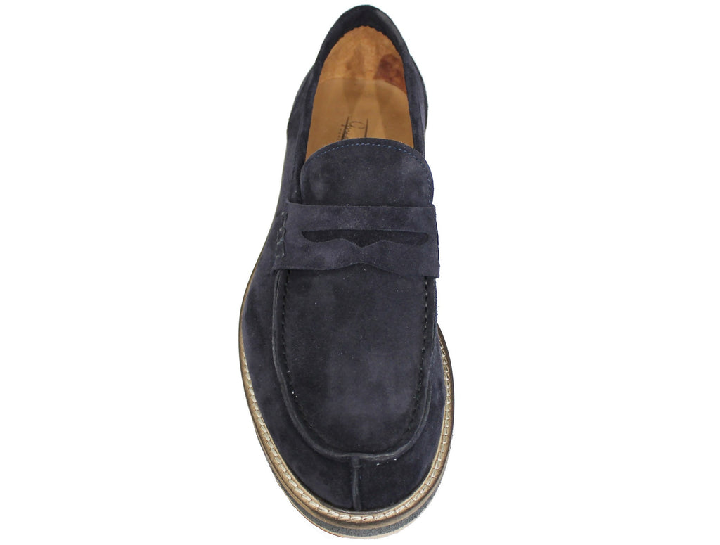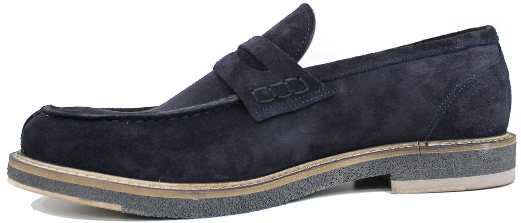 Mocassino artigianale con bocca di leone, modello EUROPA 6163, dal pellame scamosciato morbidissimo color blu, con suola in vero cuoio cucita tramite lavorazione BLAKE che rende la scarpa di grande qualità!