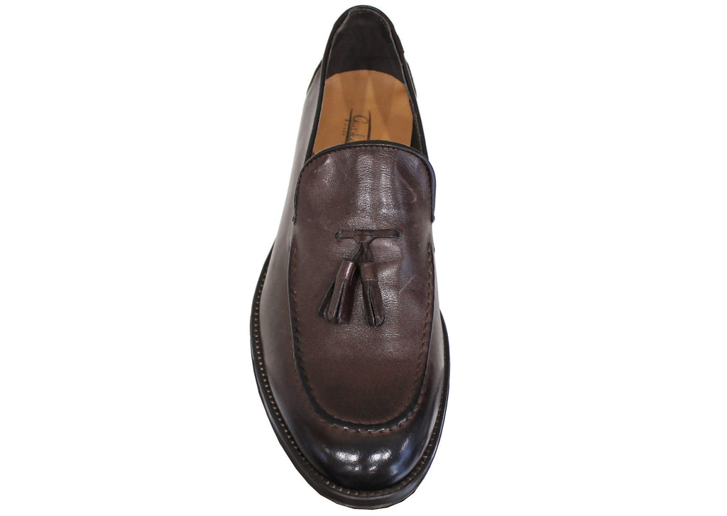 vista frontale dall'alto scarpe mocassino con nappine fiocchi uomo calzaturificio europa franco fedele guido ferri articolo 6486 in vera pelle testa di moro marrone con suola fondo in vero cuoio classico cucito e piantina in gomma molto leggero 100% made in italy fatte a mano scarpe con negozio a civitanova marche calzature italiane artigianali scarpe online eleganti e formali