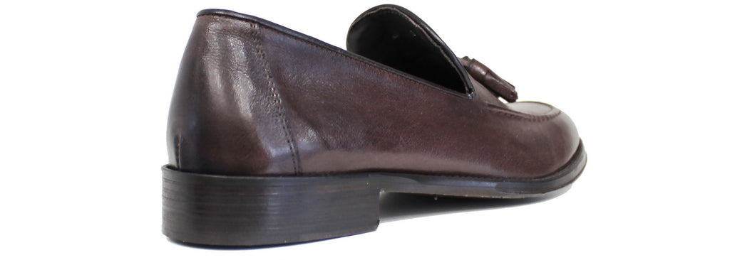 vista posteriore del tacco scarpe mocassino con nappine fiocchi uomo calzaturificio europa franco fedele guido ferri articolo 6486 in vera pelle testa di moro marrone con suola fondo in vero cuoio classico cucito e piantina in gomma molto leggero 100% made in italy fatte a mano scarpe con negozio a civitanova marche calzature italiane artigianali scarpe online eleganti e formali
