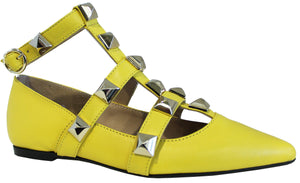 Stupenda ballerina a punta ACS CALZATURE ITALIANE in vera pelle color giallo, modello 3890, dalla suola in gomma antiscivolo molto leggera e con il cinturino completamente borchiato, è un articolo elegante che non può assolutamente mancare nella collezione di una donna!