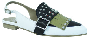Bellissimo sandalo stile mule a punta, articolo DE-5, in vera pelle bianco/nera dalla forma classica e il tallone scoperto con il cinturino che abbraccia il tallone