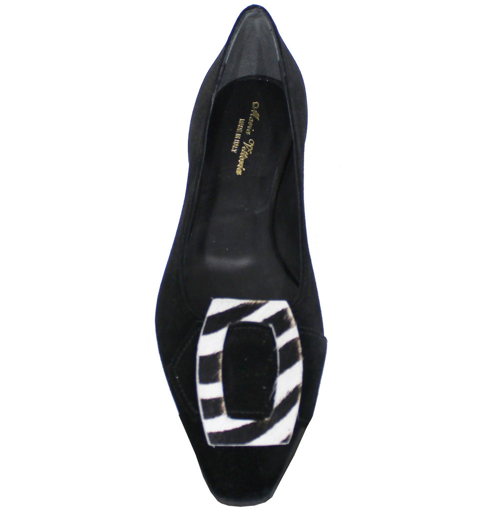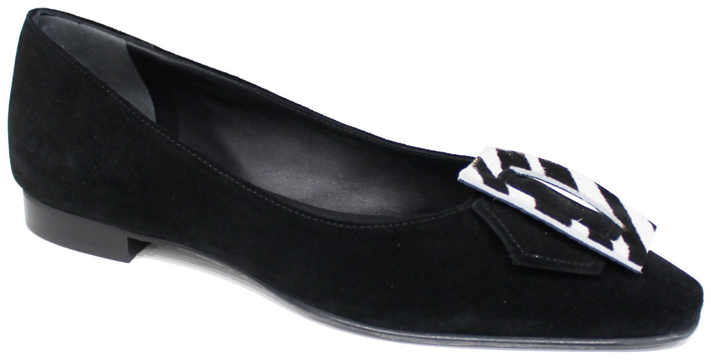 Bellissima ballerina artigianale a punta leggermente squadrata, modello LISBONA, in vera pelle scamosciata nera con un bellissimo accessorio quadrato in vero cavallini zebrato!