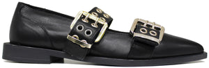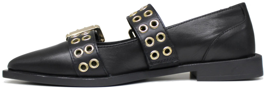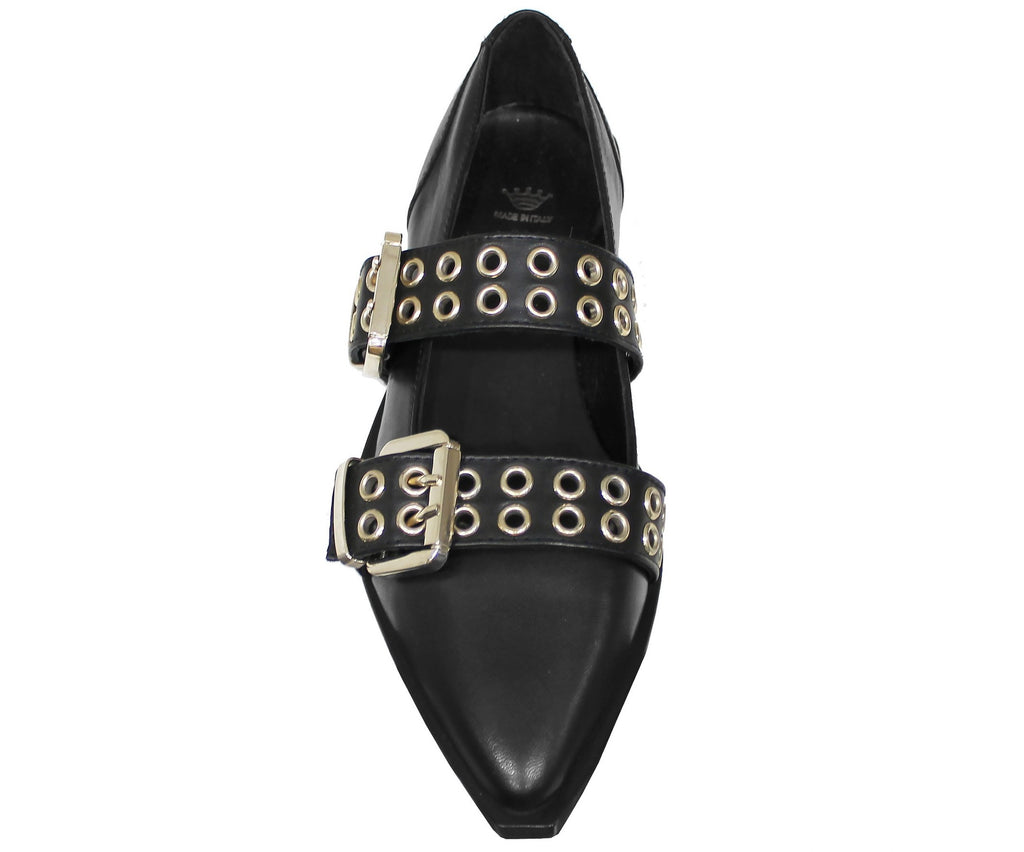 Bellissima scarpa artigianale a punta, modello CROWN SASHA N.2/2, in vera pelle nera arricchita da dei cinturini con grandi fibbioni e borchie rotonde dorate che donano a questo articolo uno stile tutto particolare e allo stesso tempo elegante di gran tendenza!