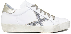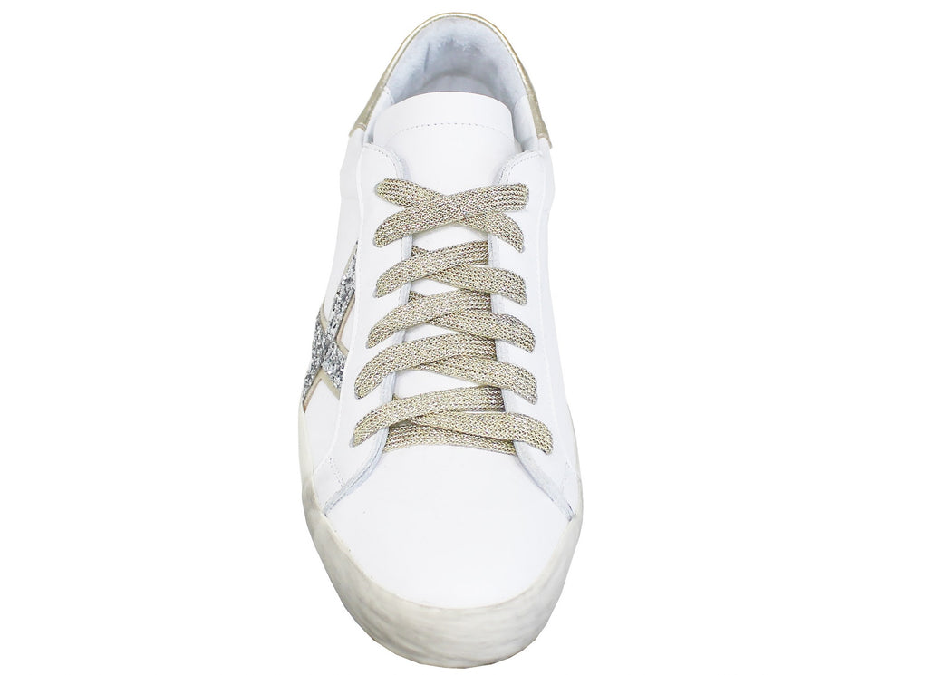 Bellissima sneaker artigianale, modello YORKI X, in vera pelle bianca con la "X" glitterata argento e sia il laccio che il talloncino di colore oro; una scarpa comoda dal particolare stile elegante / sportivo che non può assolutamente mancare nella collezione di una donna!
