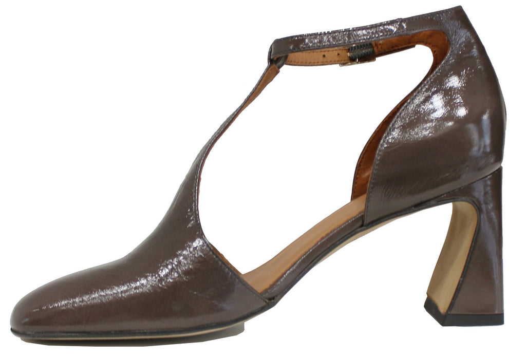 Bellissima decoltè artigianale, con l'iconico cinturino a forma di T, modello 23594, in vernice grigio elefante; modello che segue lo stile di super tendenza di questa stagione ossia il tacco largo e comodo e la punta quadrata!