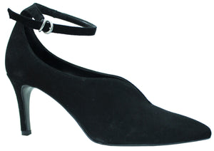 Stupenda decoltè ALTRAMAREA, articolo 8431, in vera pelle scamosciata nera, con tacco medio alto a spillo, cinturino alla caviglia e un particolare scollo a V sul collo del piede: un modello elegante e comodo, che non può assolutamente mancare nella collezione di una donna!