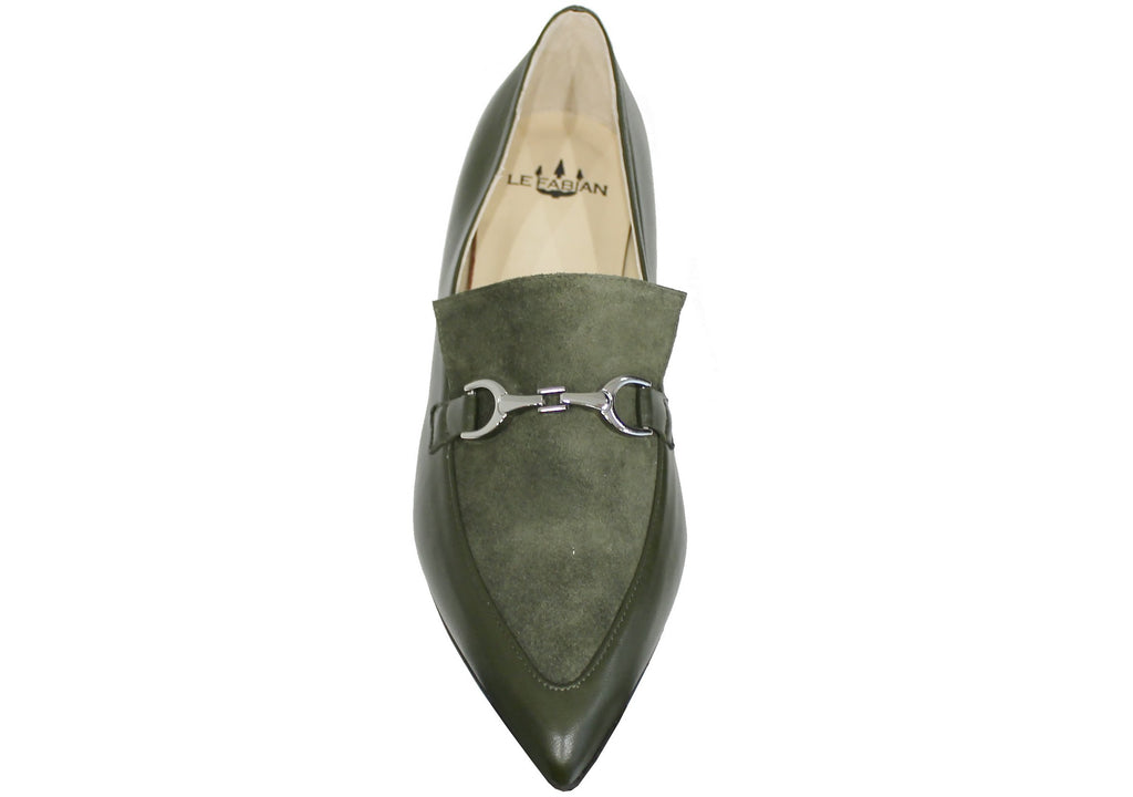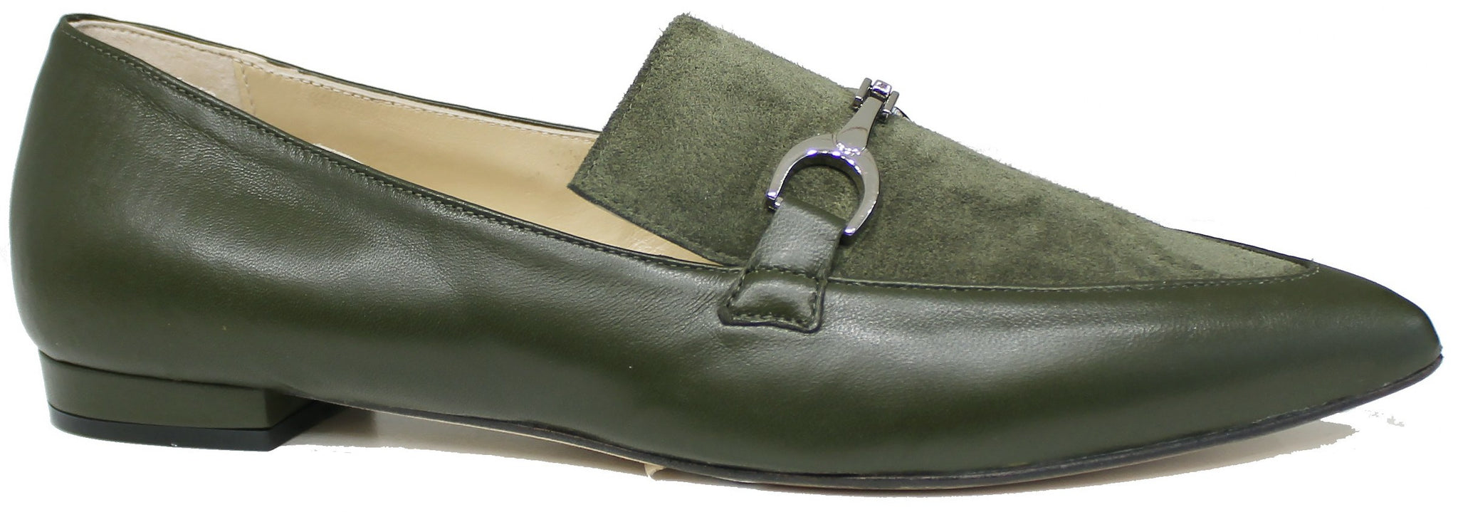 Mocassino artigianale donna a punta con morsetto, articolo LE FABIAN 8000, in vera pelle e camoscio verde militare, dalla suola in vero cuoio molto leggera e mezza piantina di gomma antiscivolo; articolo pratico ed elegante che non può assolutamente mancare nella collezione di una donna!