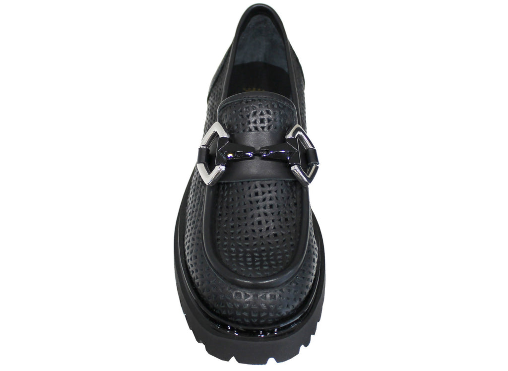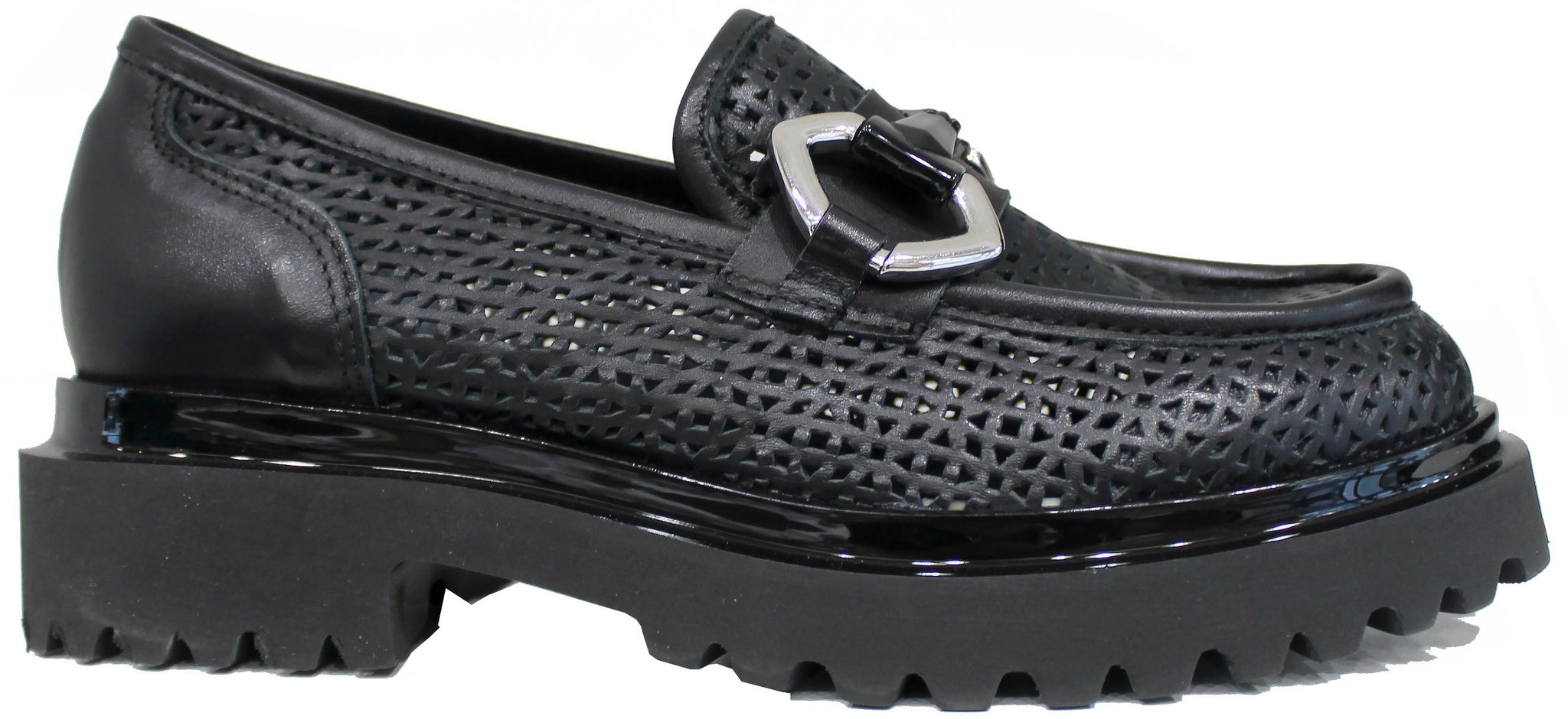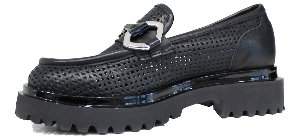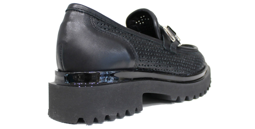 Super tendenza della stagione questo bellissimo mocassino forato, modello AB3021, con suola alta carrarmato super leggera, in vera pelle color nera e un bellissimo accessorio color argento