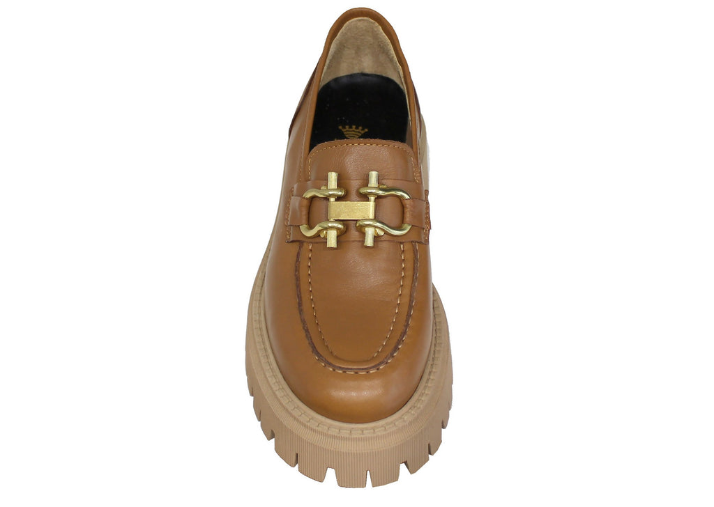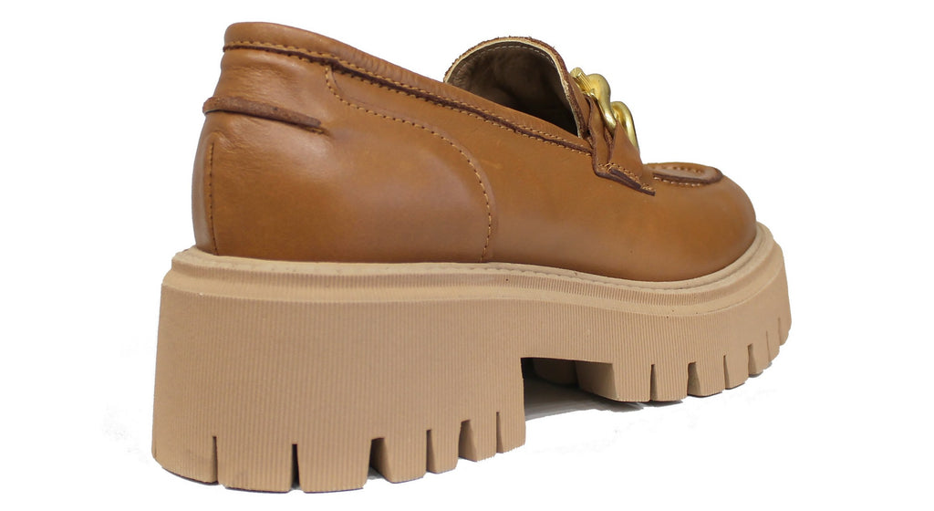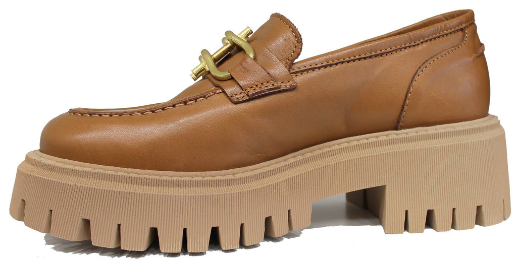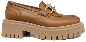 Super tendenza della stagione questo bellissimo mocassino, modello CROWN SA1107, con suola alta carrarmato in vera pelle color cuoio e un bellissimo accessorio in ottone dorato