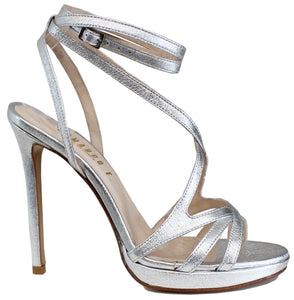 Bellissimo sandalo artigianale, modello M854, con tacco alto a spillo e plateau in vera pelle laminata argento con fasce incrociate, anche sul collo del piede, per tenerlo ben saldo e fermo per un ottima calzata; una scarpa che siamo sicuri vi farà innamorare sin dal primo passo!