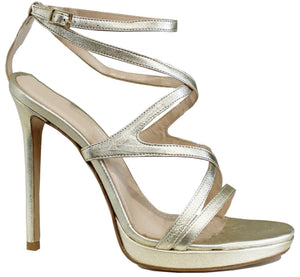 Bellissimo sandalo artigianale, modello M854, con tacco alto a spillo e plateau in vera pelle laminata oro platino con fasce incrociate, anche sul collo del piede, per tenerlo ben saldo e fermo per un ottima calzata; una scarpa che siamo sicuri vi farà innamorare sin dal primo passo!
