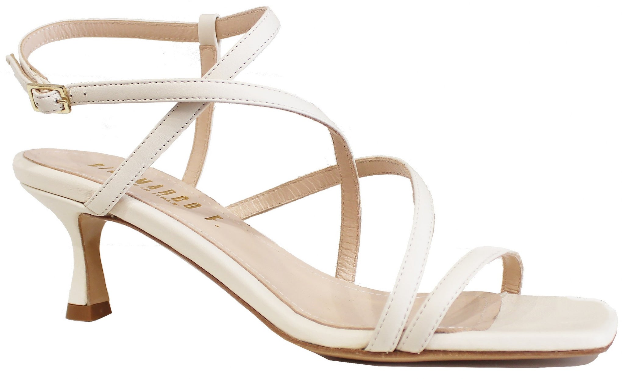 Bellissimo sandalo artigianale, modello M879, con tacco medio basso a rocchetto in vera pelle bianco panna con fasce incrociate, anche sul collo del piede, per tenerlo ben saldo e fermo per un ottima calzata; una scarpa che siamo sicuri vi farà innamorare sin dal primo passo!