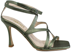 Bellissimo sandalo artigianale, modello M870, con tacco medio alto a rocchetto in vera pelle laminata color verde acido con fasce incrociate, anche sul collo del piede, per tenerlo ben saldo e fermo per un ottima calzata; una scarpa che siamo sicuri vi farà innamorare sin dal primo passo!