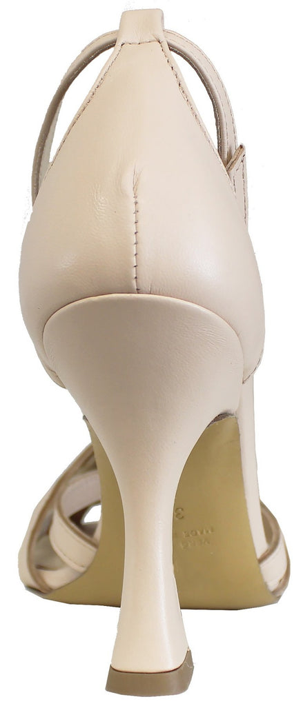 Bellissimo sandalo, modello 9110, con tacco alto largo a rocchetto, fondo in cuoio e cinturino dalla classica forma a T in vera pelle bianco cipria e cuoio; una scarpa elegante e davvero molto comoda che non può assolutamente mancare nella collezione di una donna!