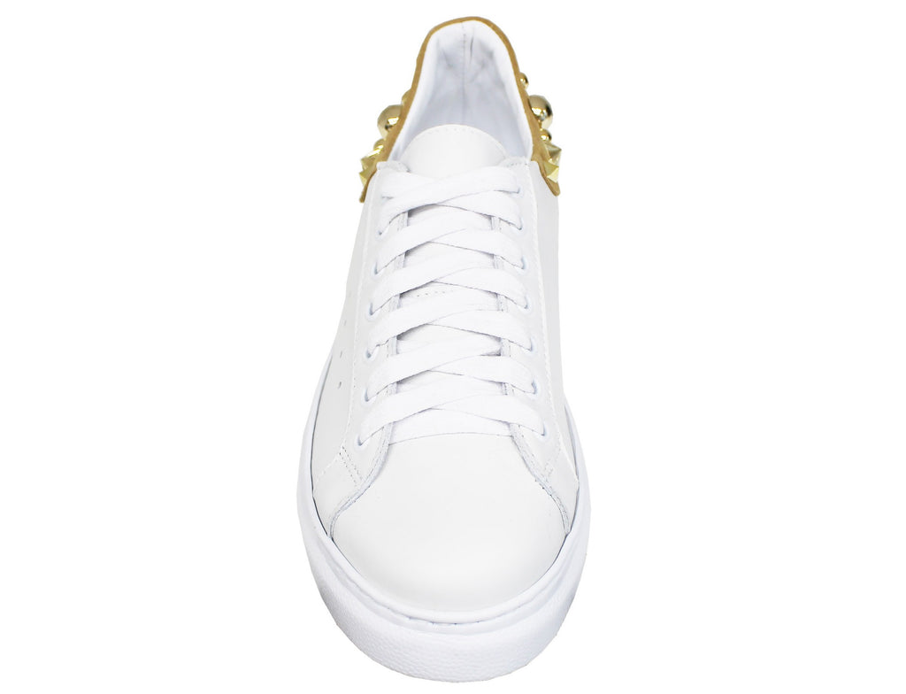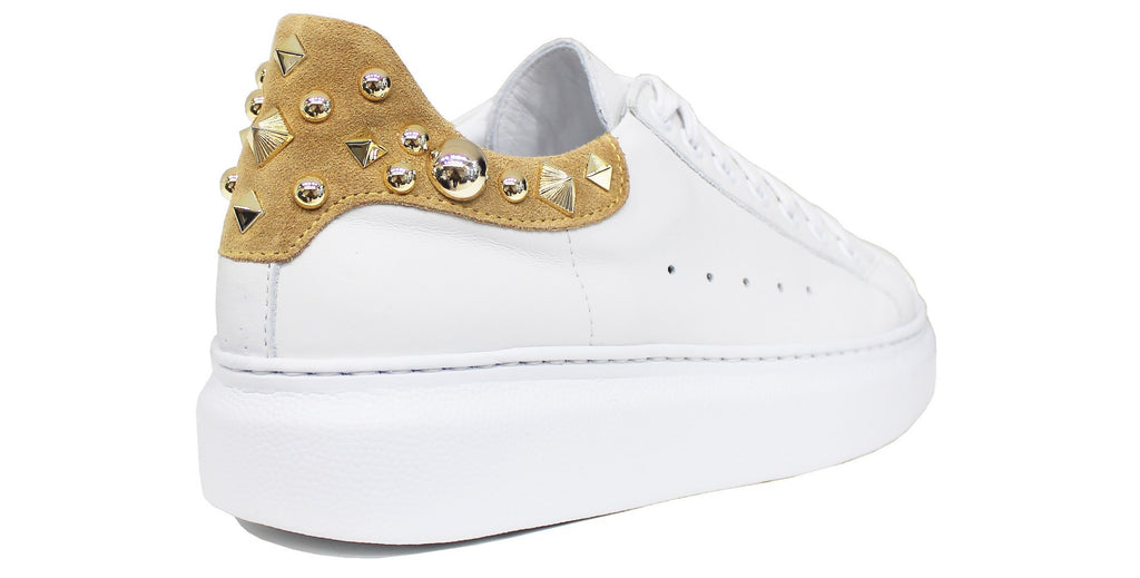 scarpe sneaker bassa alex mixer in vera pelle bianca con tallone dietro scamosciato color cuoio cola interamente borchiato pietre oro pellame molto morbido suola molto leggera alta rialzata in eva oversize 100% made in italy scarpe con negozio a civitanova marche collezione moda soletta morbida estraibile per plantare calzature artigianali made in italy scarpe online pagamento alla consegna