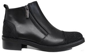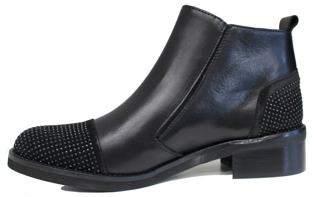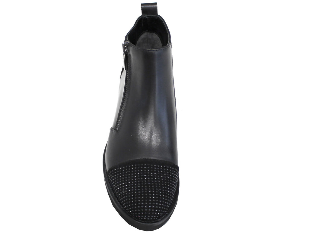 Stivaletto artigianale, articolo 5472, con punta e tallone strassati e un pellame molto morbido color nero con fondo in gomma antiscivolo; una scarpa elegante e comoda che non può assolutamente mancare nella collezione di una donna!