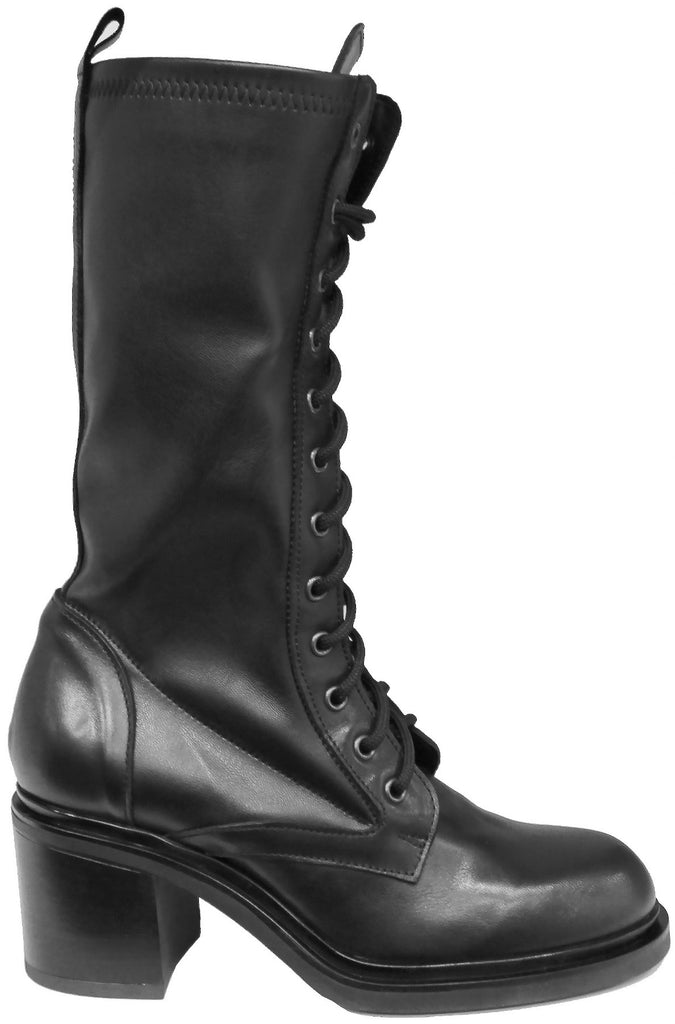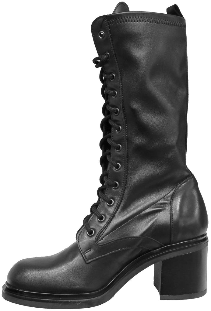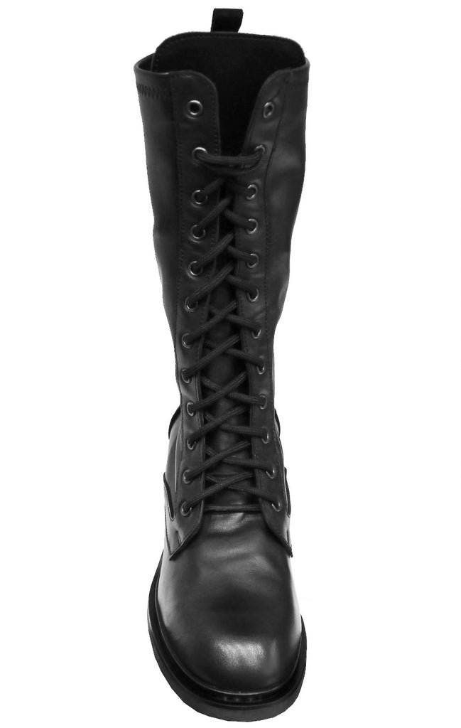 Bellissimo anfibio artigianale allacciato, modello CROWN M2, in vera pelle nera con gambale interamente in stretch in modo che si adatti e rimanga bello aderente alla gamba