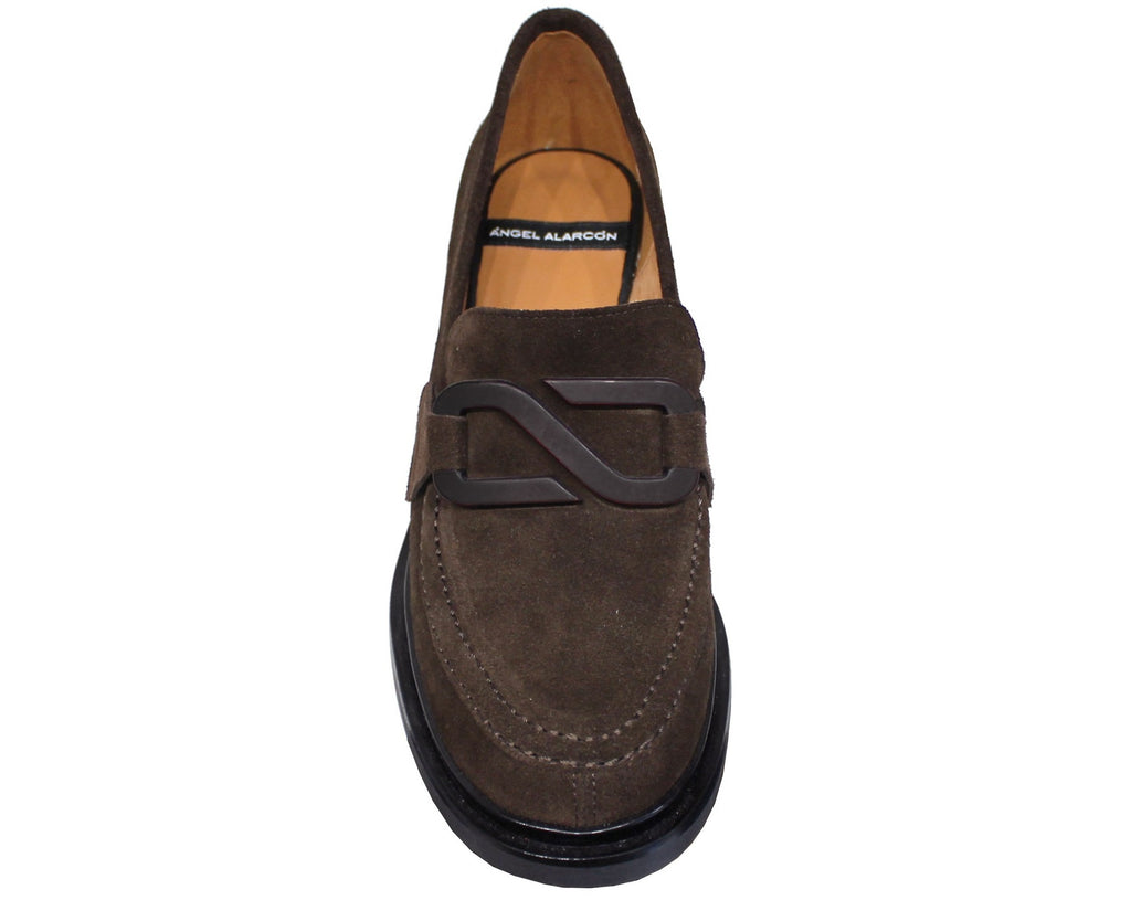 Bellissimo mocassino artigianale dallo stile casual elegante/sportivo, modello ANGEL ALARCON 24595, in vera pelle scamosciata marrone, tonalità testa di moro, con un bel tacco largo arricchito da un bell'accessorio in tinta