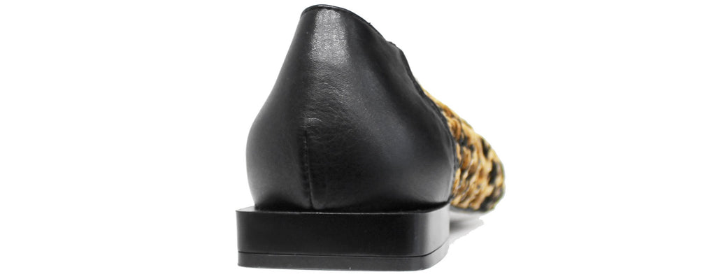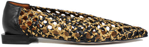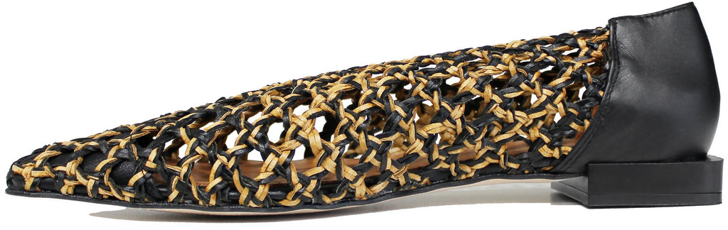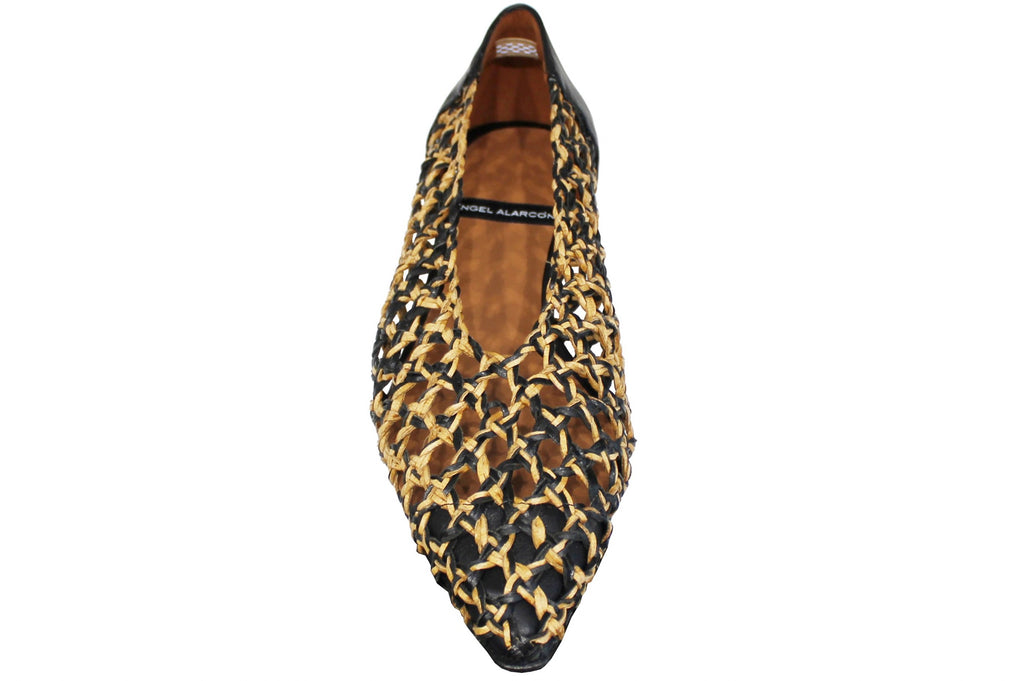 Ballerina a punta artigianale, modello ANGEL ALARCON 25013, realizzata in vera pelle intrecciata bicolore cuoio e nero, molto morbida, con topponcino posteriore e puntale in pelle nera