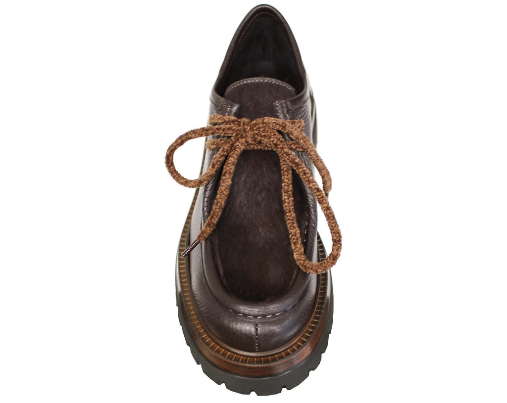 Gran tendenza della stagione questa bellissima novità ACS, modello PARABOOT CINIGLIA, realizzata in vera pelle martellata marrone, tonalità testa di moro, con la patta centrale in cavallino e dei bellissimi lacci in ciniglia.